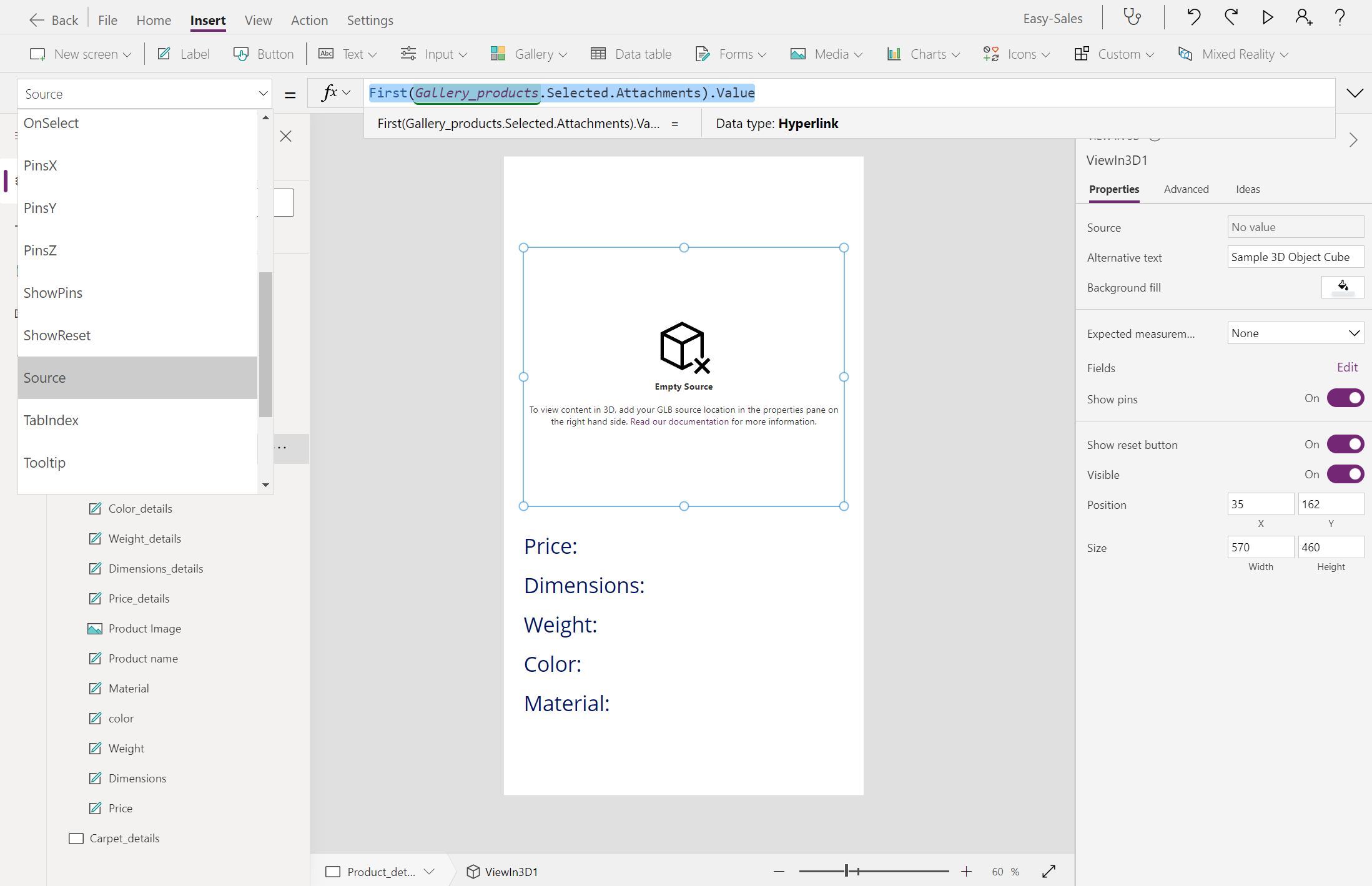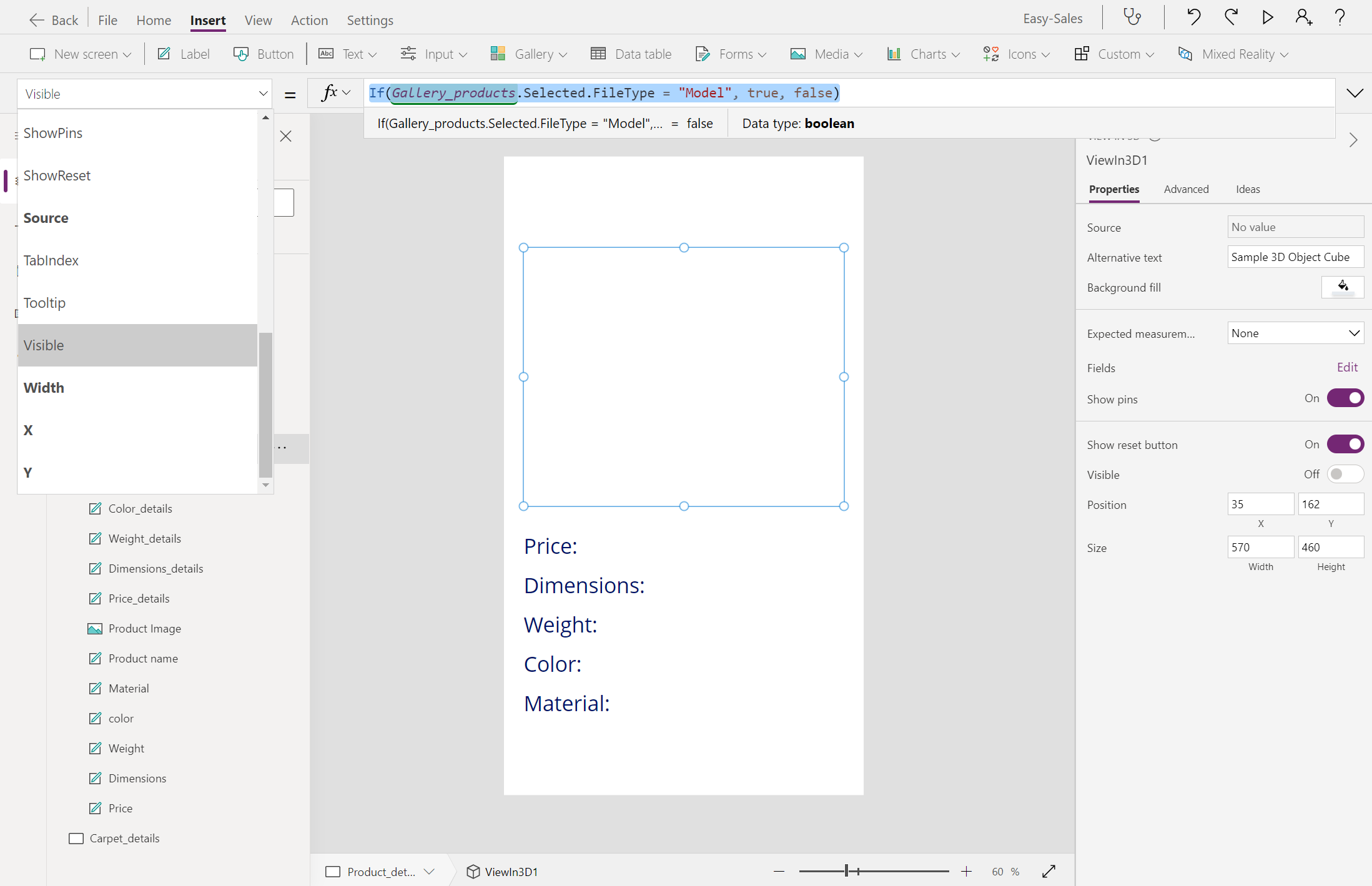 First(Gallery_products.Selected.Attachments).Valueאנו נבצע את המאפיין Visible הן של Image והן של View ברכיבי תלת-ממדיים כדי להציג בקלות את המוצרים בהתאם לסוג הקובץ המאוחסן בעמודה קבצים מצורפים. קבע את התצורה המאפיין visible של image ו- View ברכיבים תלת-ממדיים באופן הבא: