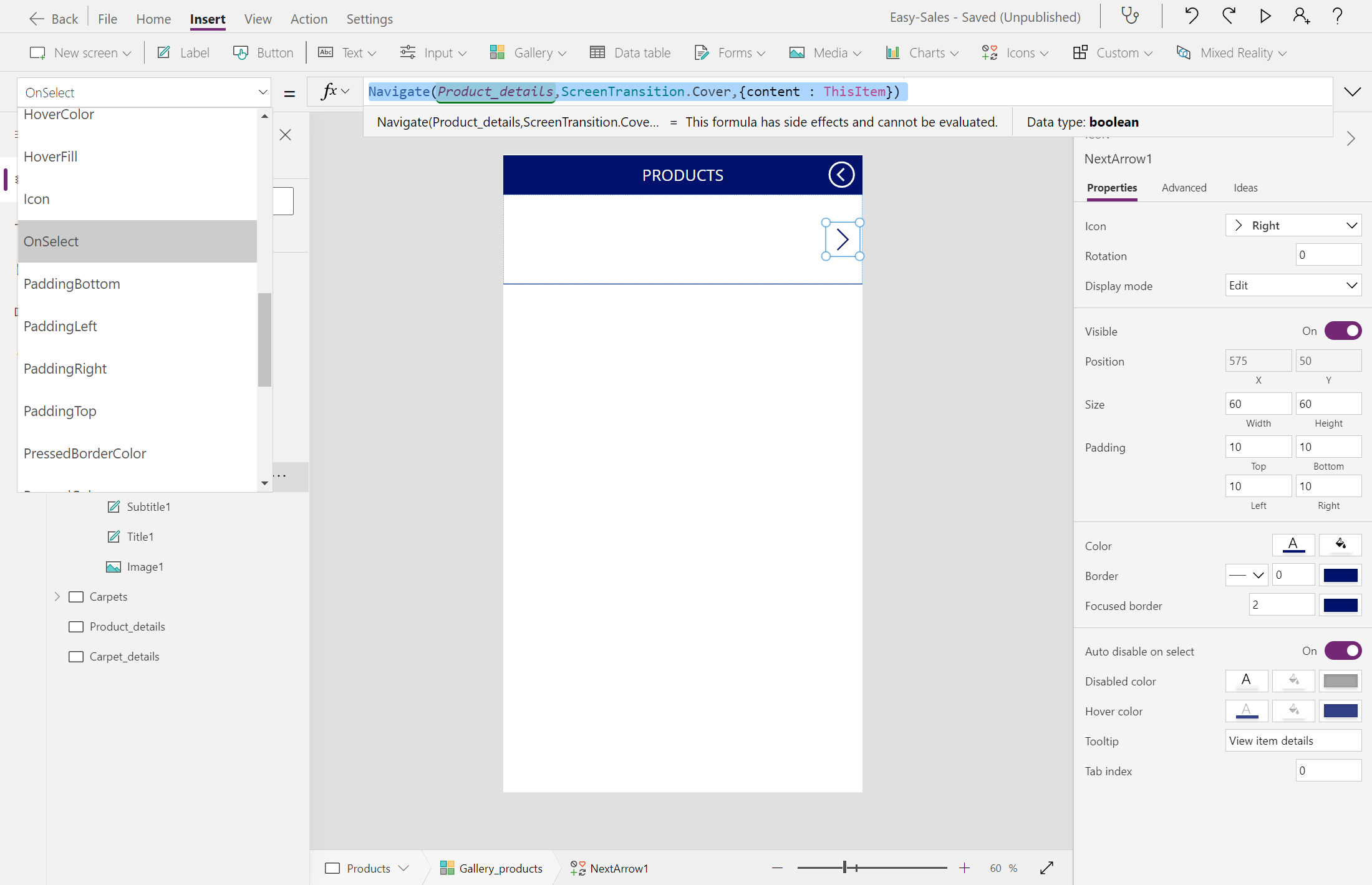 Navigate('Products',ScreenTransition.Cover)בצע את אותו הליך עבור Carpet_details. התאם אישית את נווט הפונקציה בהתאם.