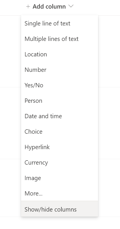 ברשימת SharePoint שנוצרה בשם Easy Sales, בחר את + הוסף עמודה ולאחר מכן בחר הצג/הסתר עמודות.