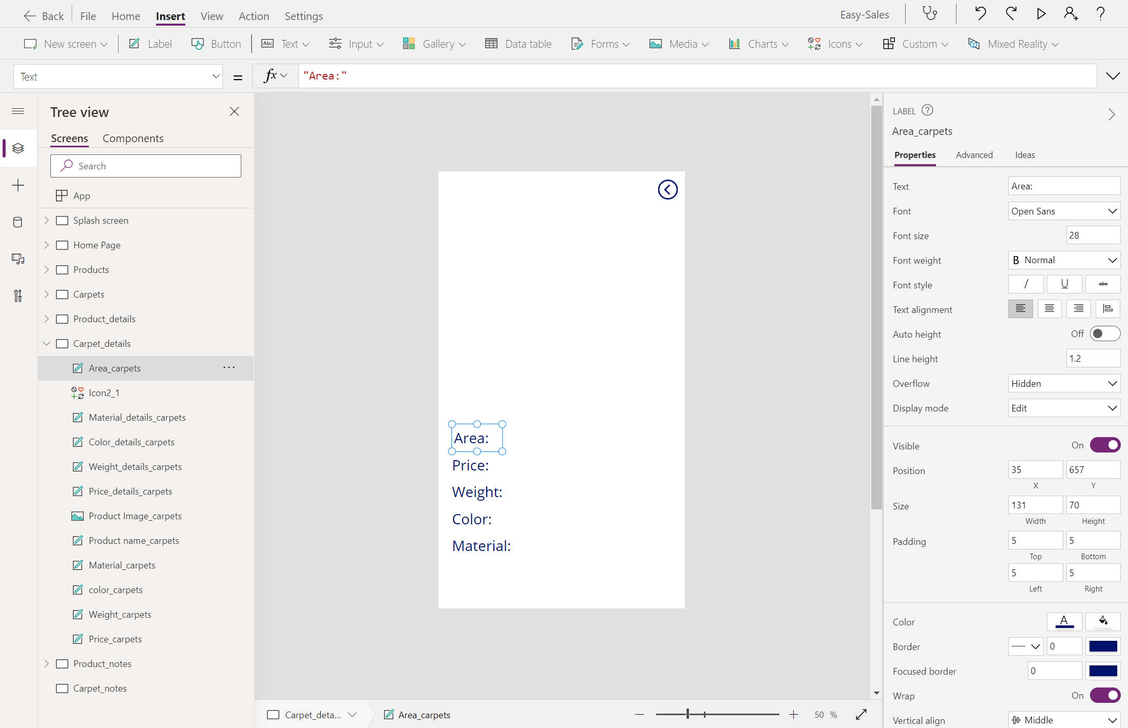 עבור אל דף Carpet_details ולאחר מכן הוסף תווית חדשהולאחר מכן שנה את שם Area_carpets.
