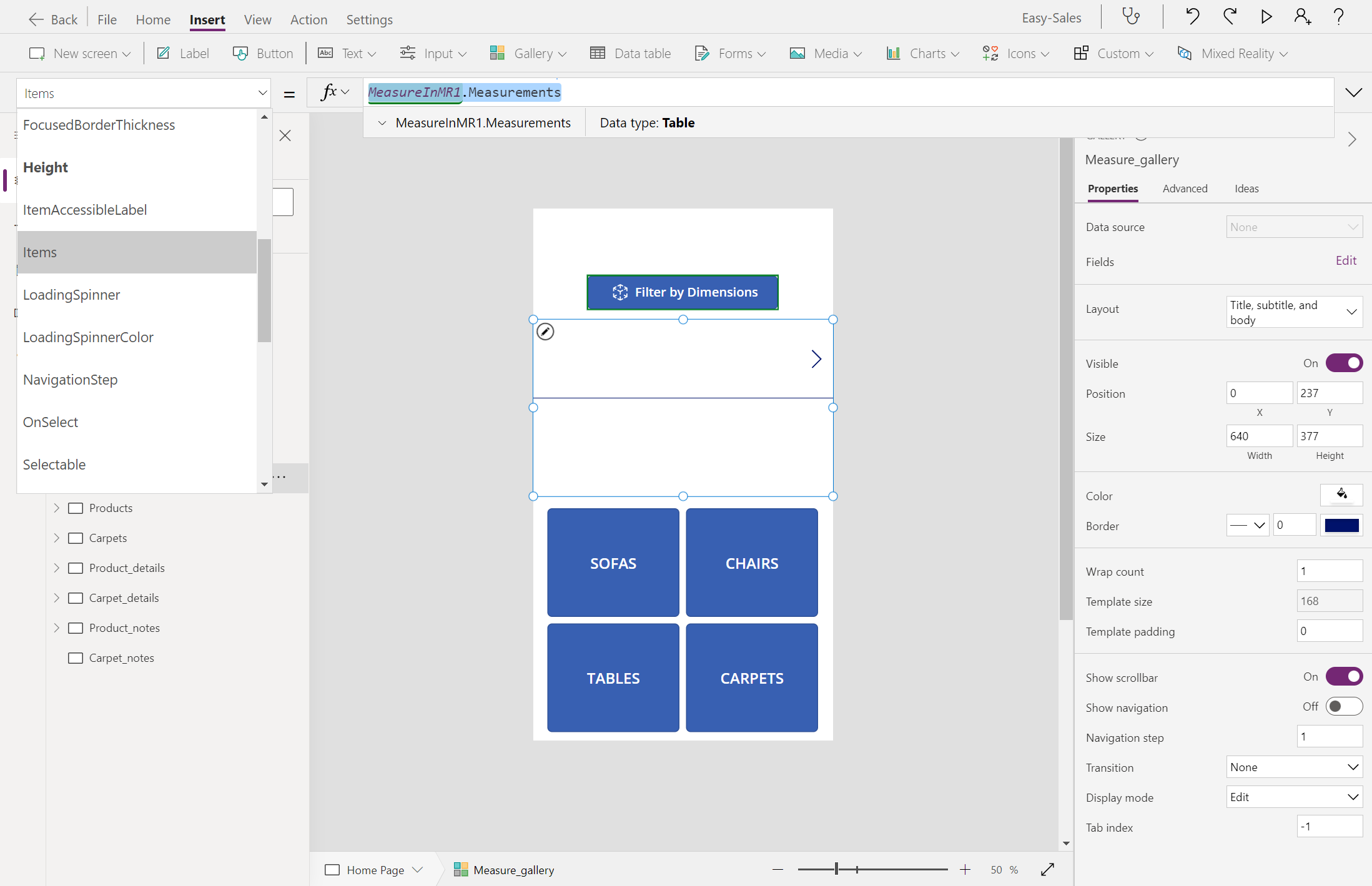 קבע את תצורת הפריטים המאפיין של Measure_gallery-ידי הוספת השורה הבאה: