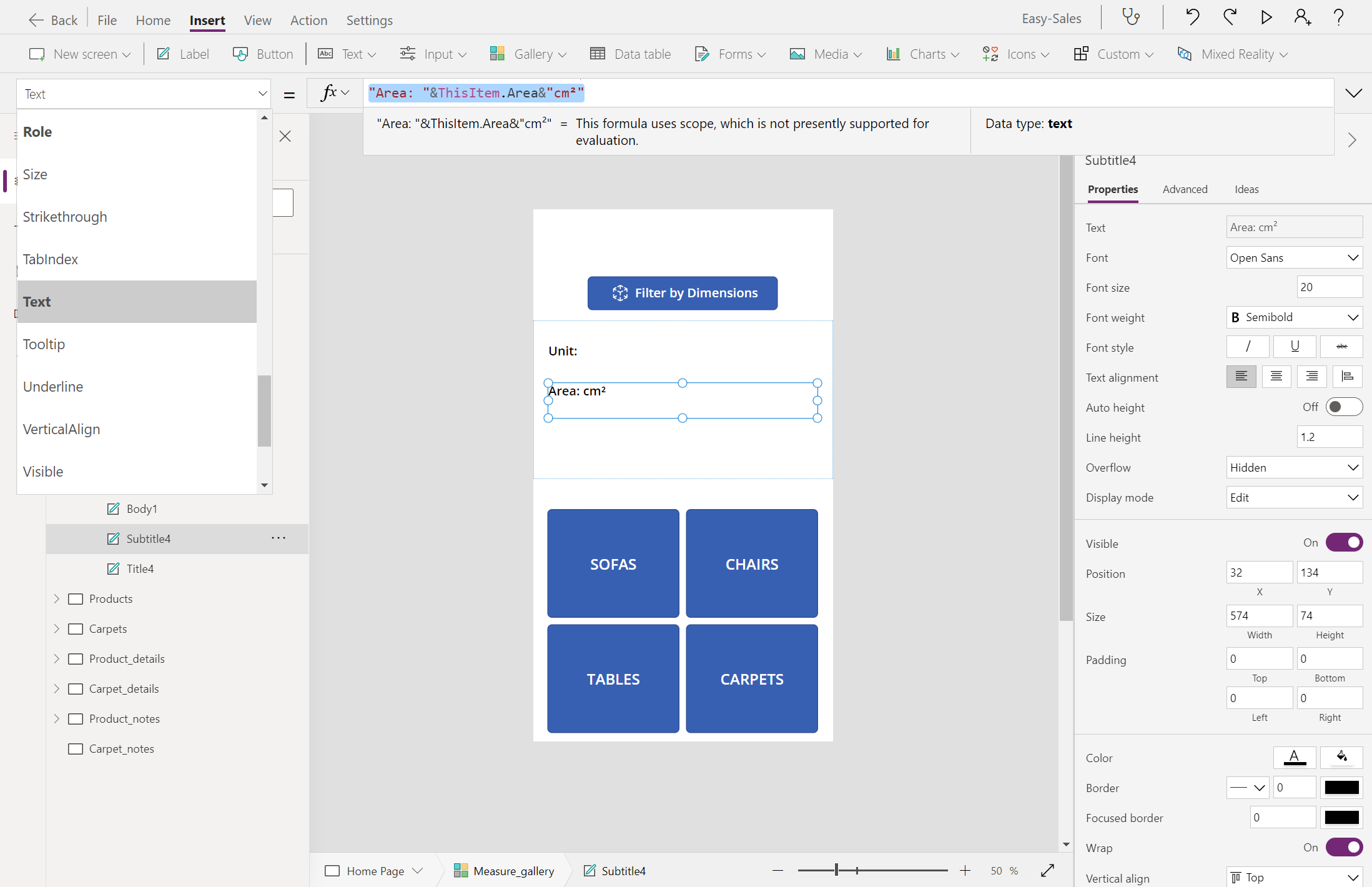 If( ID = 1 And Measure_gallery.Selected.Height = 0, (Filter('Easy Sales',(ProductCategory = "Sofa") And ((Depth < Measure_gallery.Selected.BoundingDepth And Width < Measure_gallery.Selected.BoundingWidth) Or (Depth < Measure_gallery.Selected.BoundingWidth And Width < Measure_gallery.Selected.BoundingDepth)))), ID = 1 And Measure_gallery.Selected.Height > 0, (Filter('Easy Sales',(ProductCategory = "Sofa") And ((Depth < Measure_gallery.Selected.BoundingDepth And Width < Measure_gallery.Selected.BoundingWidth And Height <= Measure_gallery.Selected.Height) Or (Depth < Measure_gallery.Selected.BoundingWidth And Width < Measure_gallery.Selected.BoundingDepth And Height <= Measure_gallery.Selected.Height)))), ID = 1, Filter('Easy Sales',ProductCategory = "Sofa"), ID = 2, Filter('Easy Sales',ProductCategory = "Chair"), ID = 2 And Measure_gallery.Selected.Height = 0, (Filter('Easy Sales',(ProductCategory = "Chair") And ((Depth < Measure_gallery.Selected.BoundingDepth And Width < Measure_gallery.Selected.BoundingWidth) Or (Depth < Measure_gallery.Selected.BoundingWidth And Width < Measure_gallery.Selected.BoundingDepth)))), ID = 2 And Measure_gallery.Selected.Height > 0, (Filter('Easy Sales',(ProductCategory = "Chair") And ((Depth < Measure_gallery.Selected.BoundingDepth And Width < Measure_gallery.Selected.BoundingWidth And Height <= Measure_gallery.Selected.Height) Or (Depth < Measure_gallery.Selected.BoundingWidth And Width < Measure_gallery.Selected.BoundingDepth And Height <= Measure_gallery.Selected.Height)))), ID = 3, Filter('Easy Sales',ProductCategory = "Table"), ID = 3 And Measure_gallery.Selected.Height = 0, (Filter('Easy Sales',(ProductCategory = "Table") And ((Depth < Measure_gallery.Selected.BoundingDepth And Width < Measure_gallery.Selected.BoundingWidth) Or (Depth < Measure_gallery.Selected.BoundingWidth And Width < Measure_gallery.Selected.BoundingDepth)))), ID = 3 And Measure_gallery.Selected.Height > 0, (Filter('Easy Sales',(ProductCategory = "Table") And ((Depth < Measure_gallery.Selected.BoundingDepth And Width < Measure_gallery.Selected.BoundingWidth And Height <= Measure_gallery.Selected.Height) Or (Depth < Measure_gallery.Selected.BoundingWidth And Width < Measure_gallery.Selected.BoundingDepth And Height <= Measure_gallery.Selected.Height)))) )חשוב