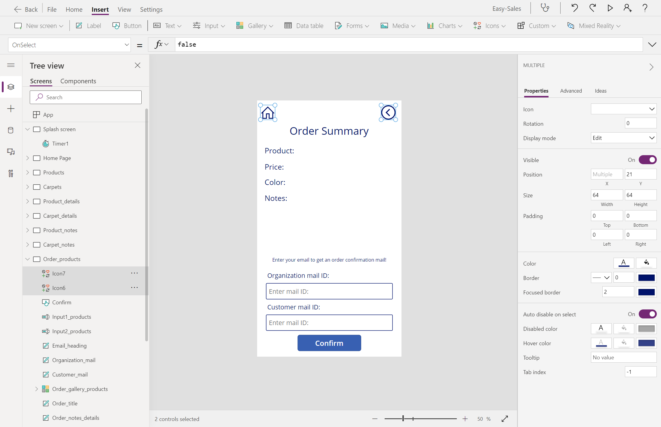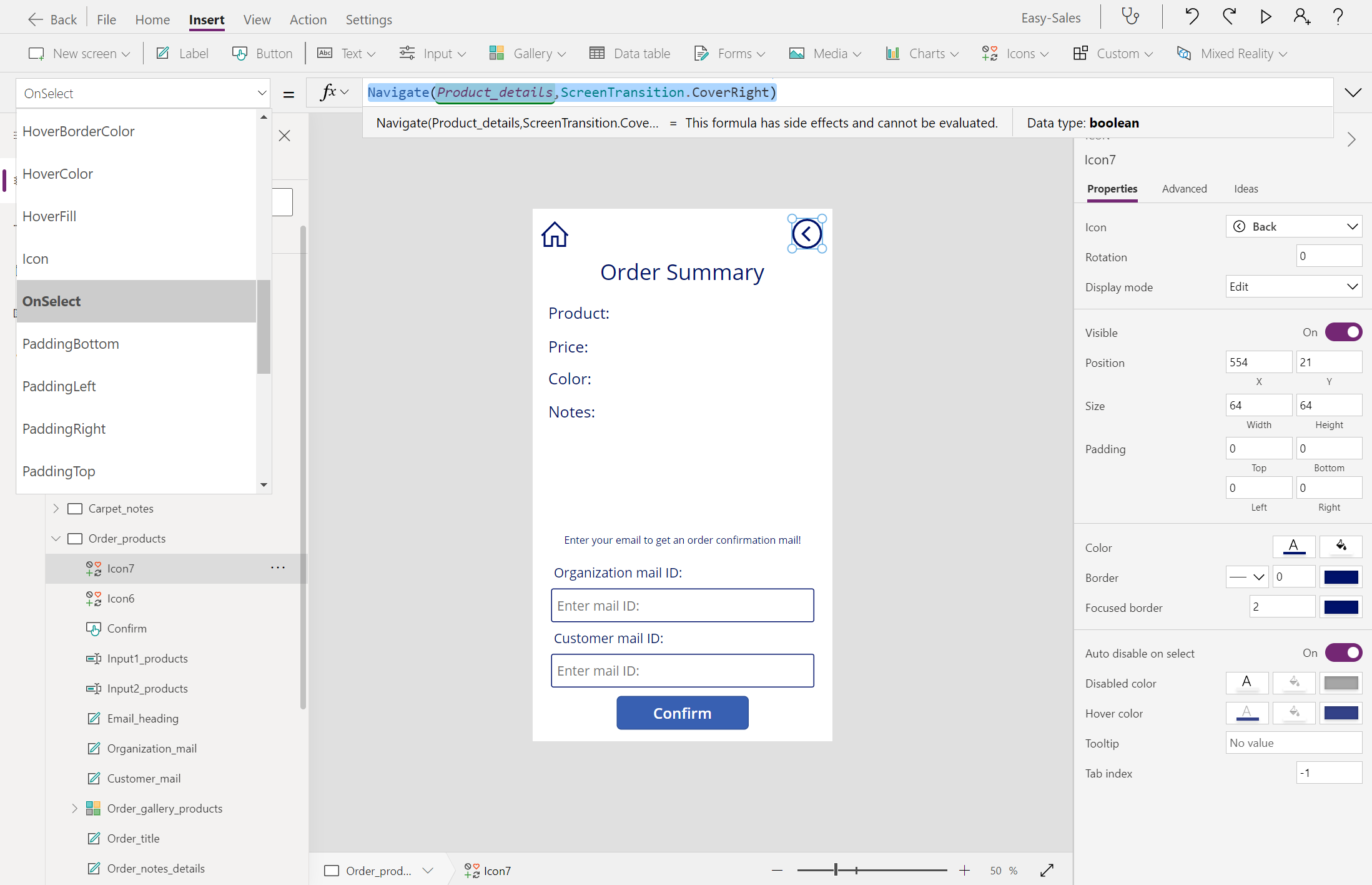 בחר את המסך Product_details ולאחר מכן קבע את תצורת המאפיין OnSelect של לחצן סדר באופן הבא: