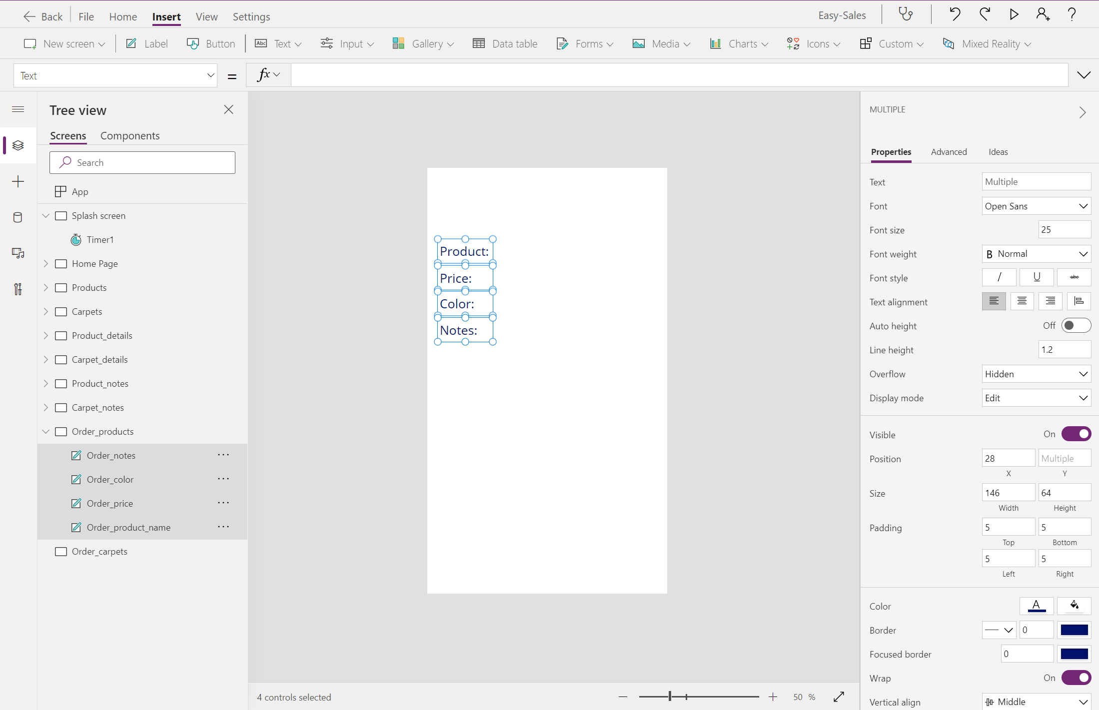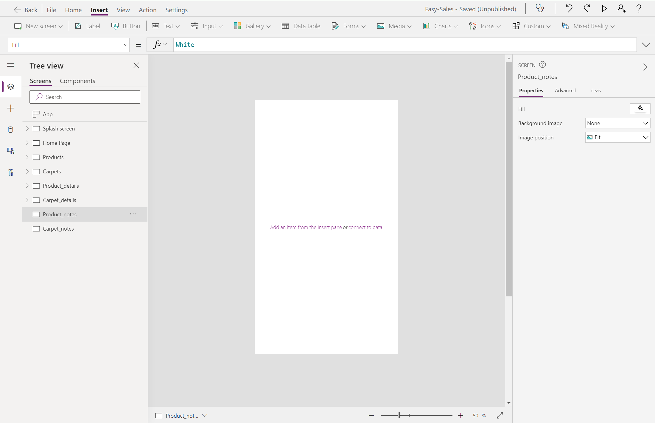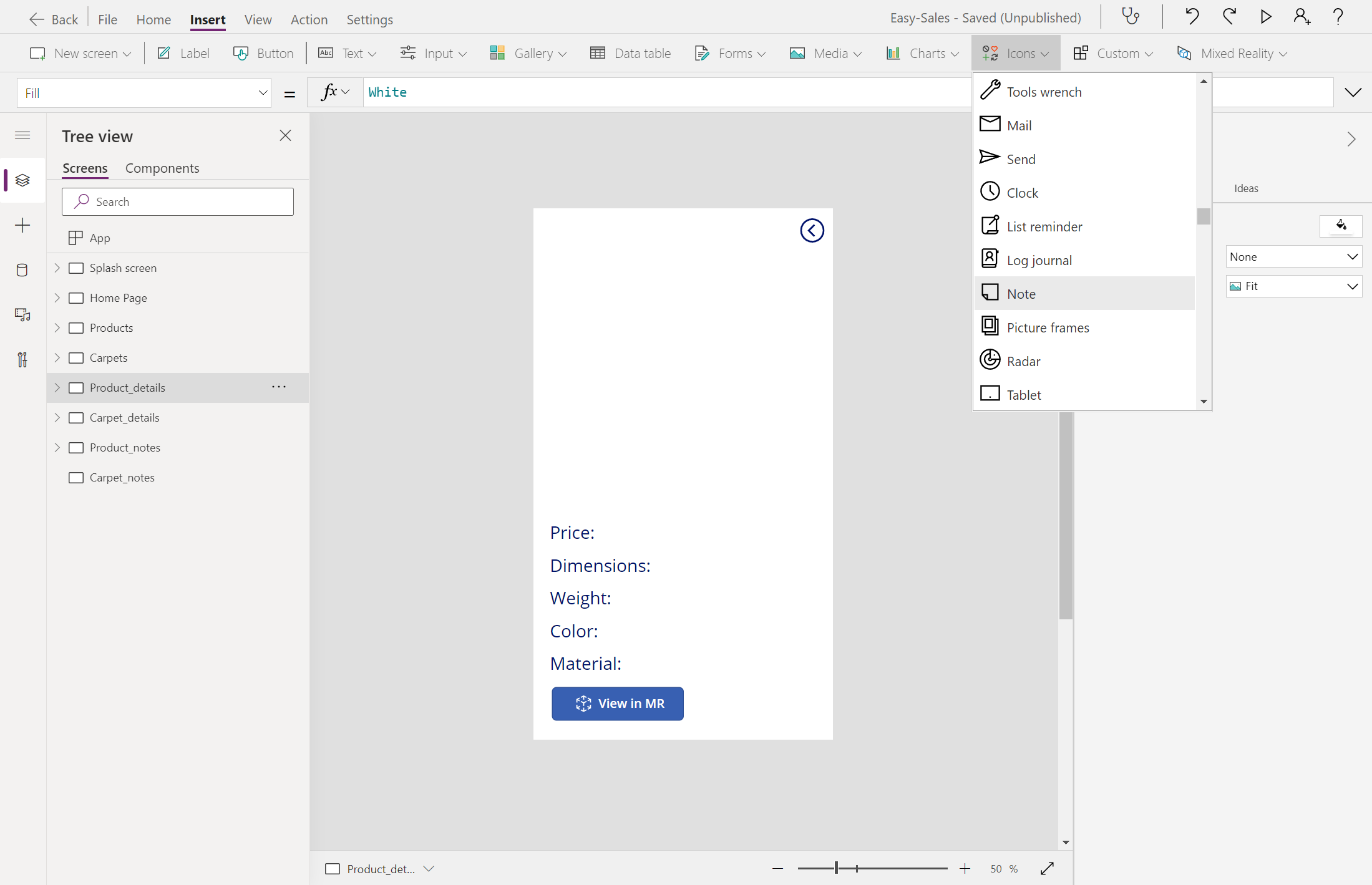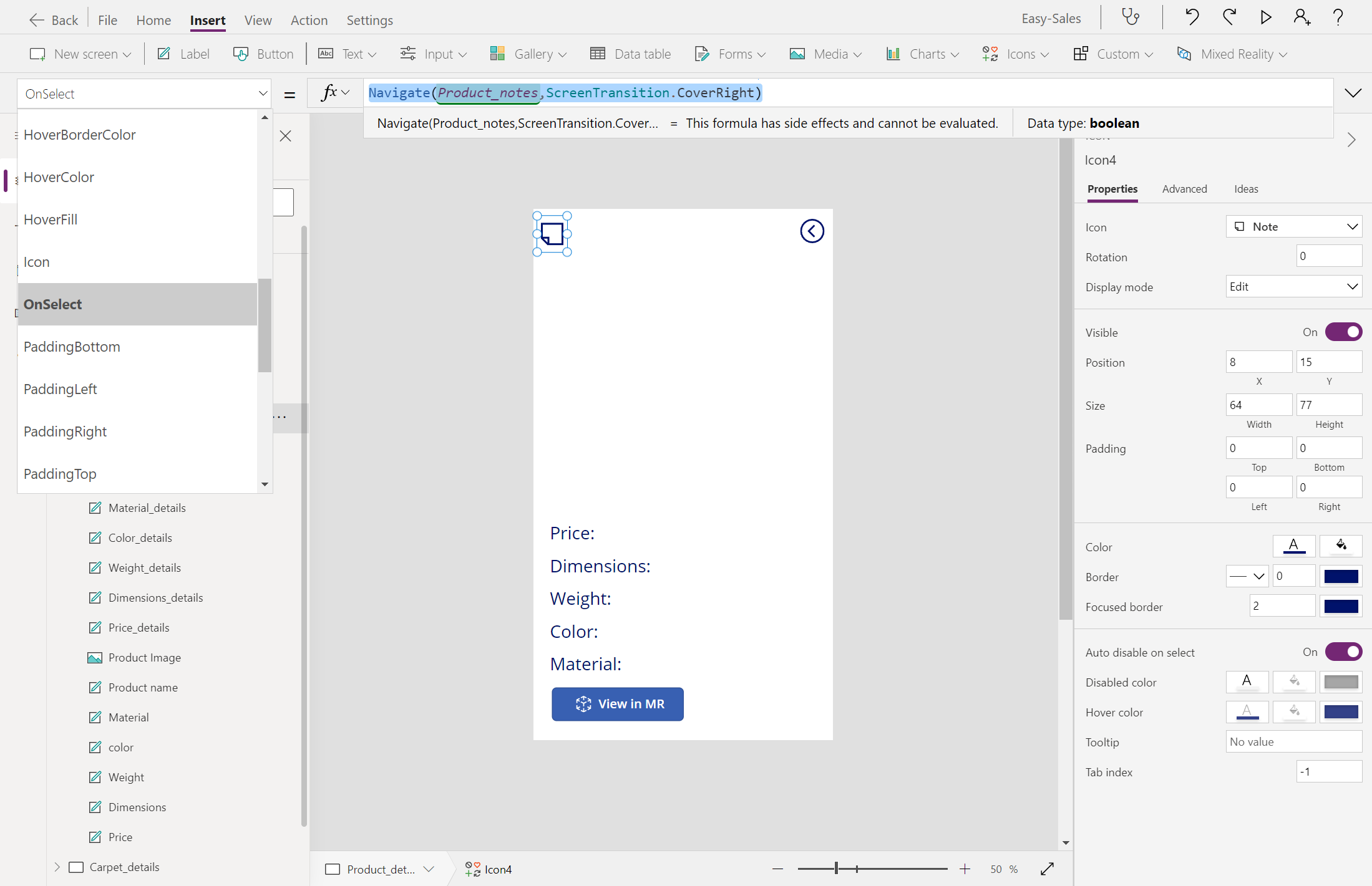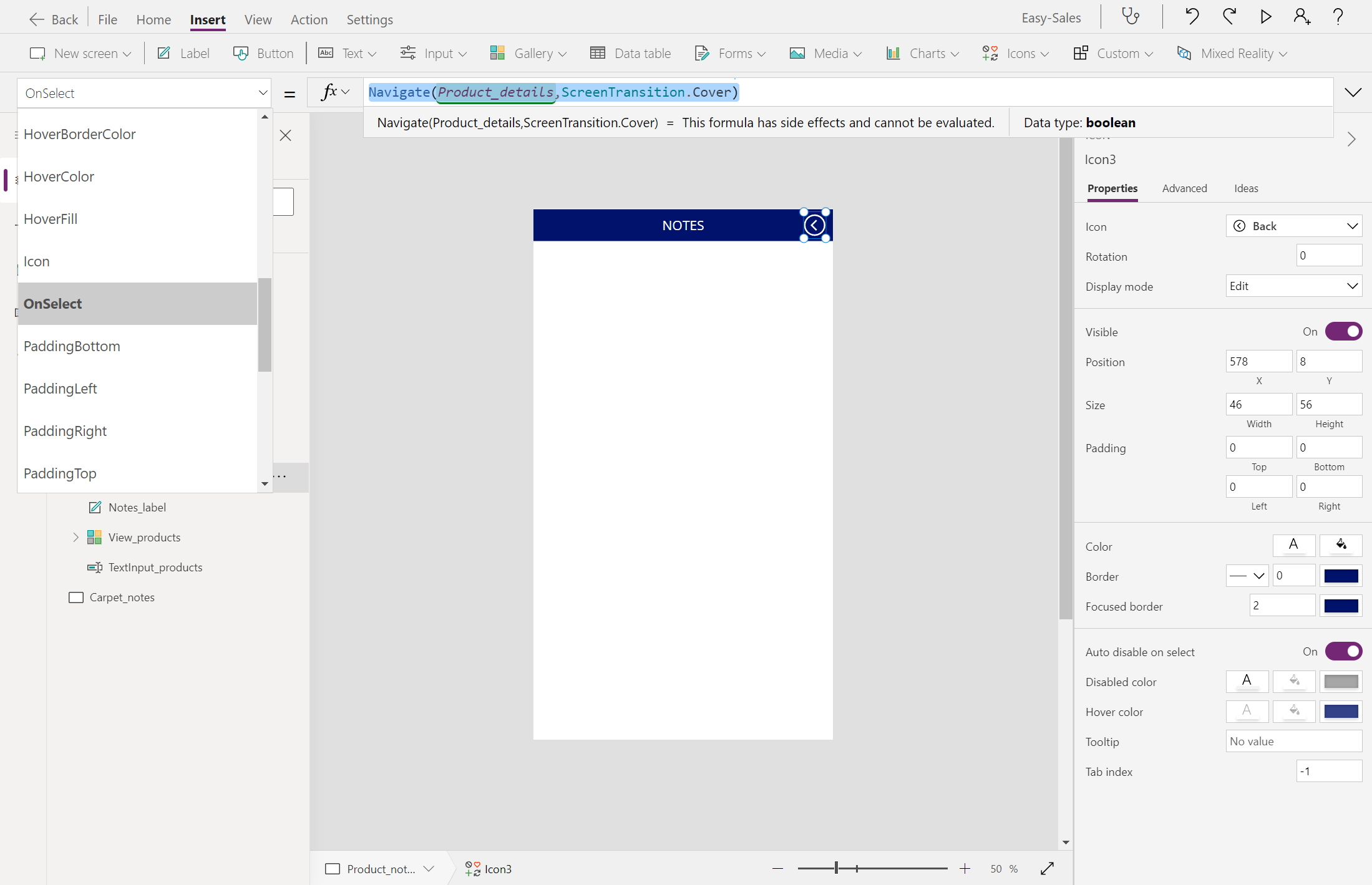 Navigate(Product_details,ScreenTransition.Cover)עבור למסך Product_details והוסף סמל הערה מהרשימה הנפתחת סמלים בכרטיסיה הוספה .