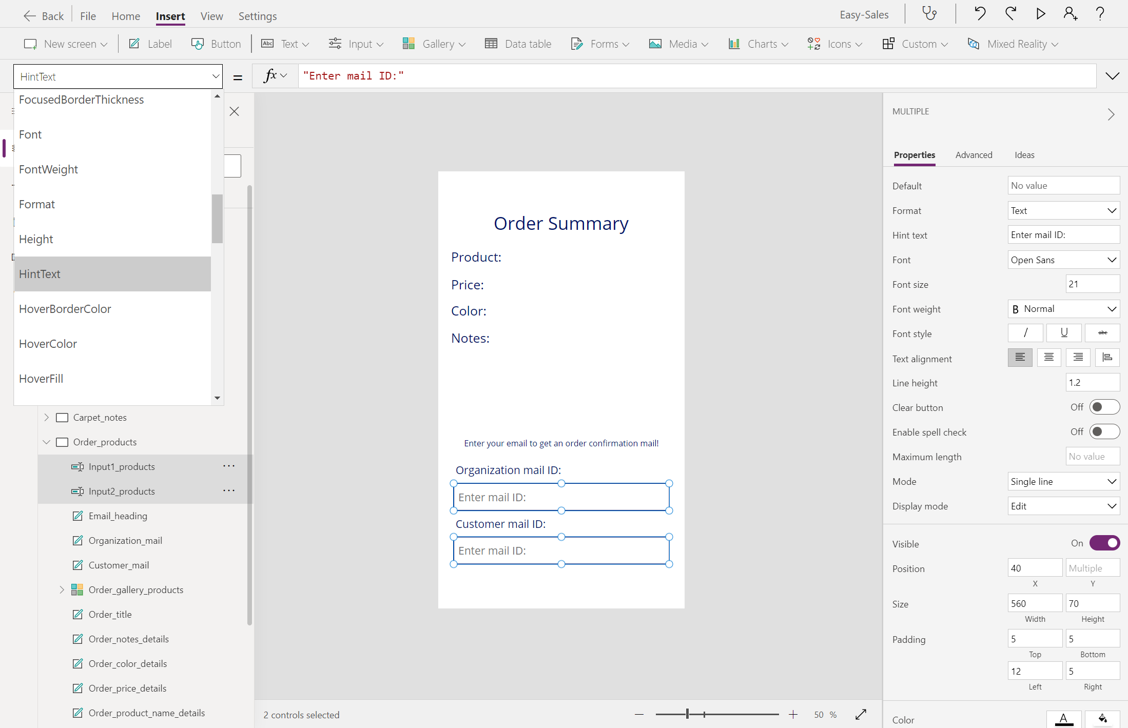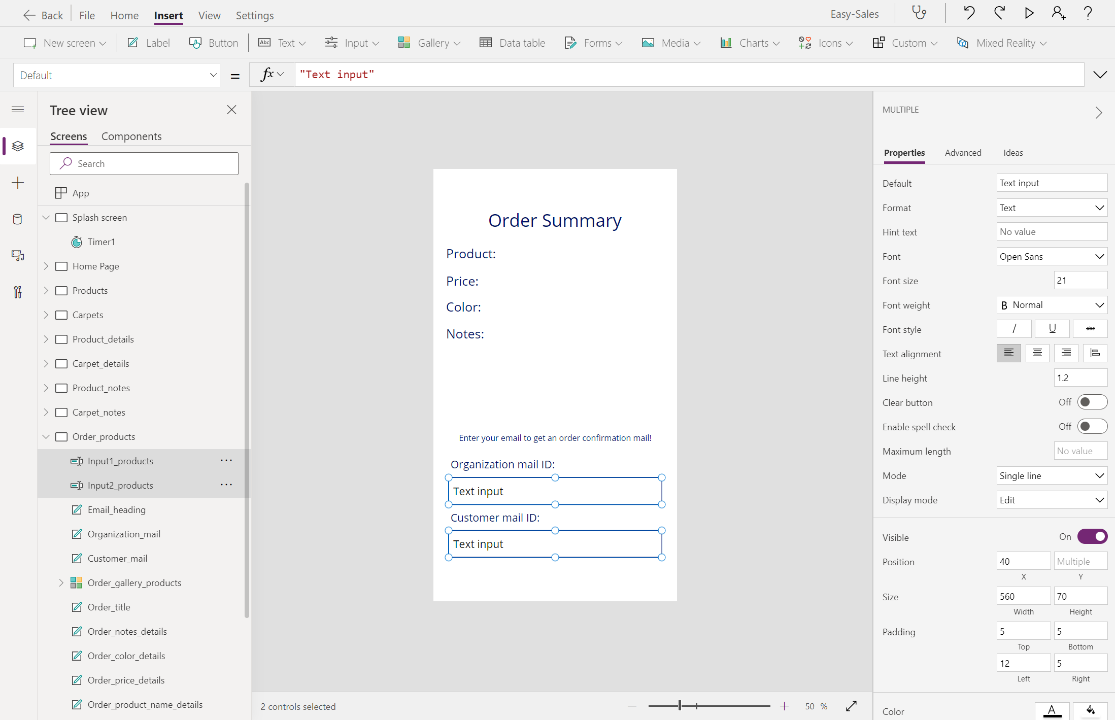 הרחב את הרשימה הנפתחת קלט ובחר קלט טקסט. הוסף שני רכיבי קלט טקסט למסך ומקם אותם כפי שמוצג בתמונה. שנה את שמם Input1_products ו- Input2_products.