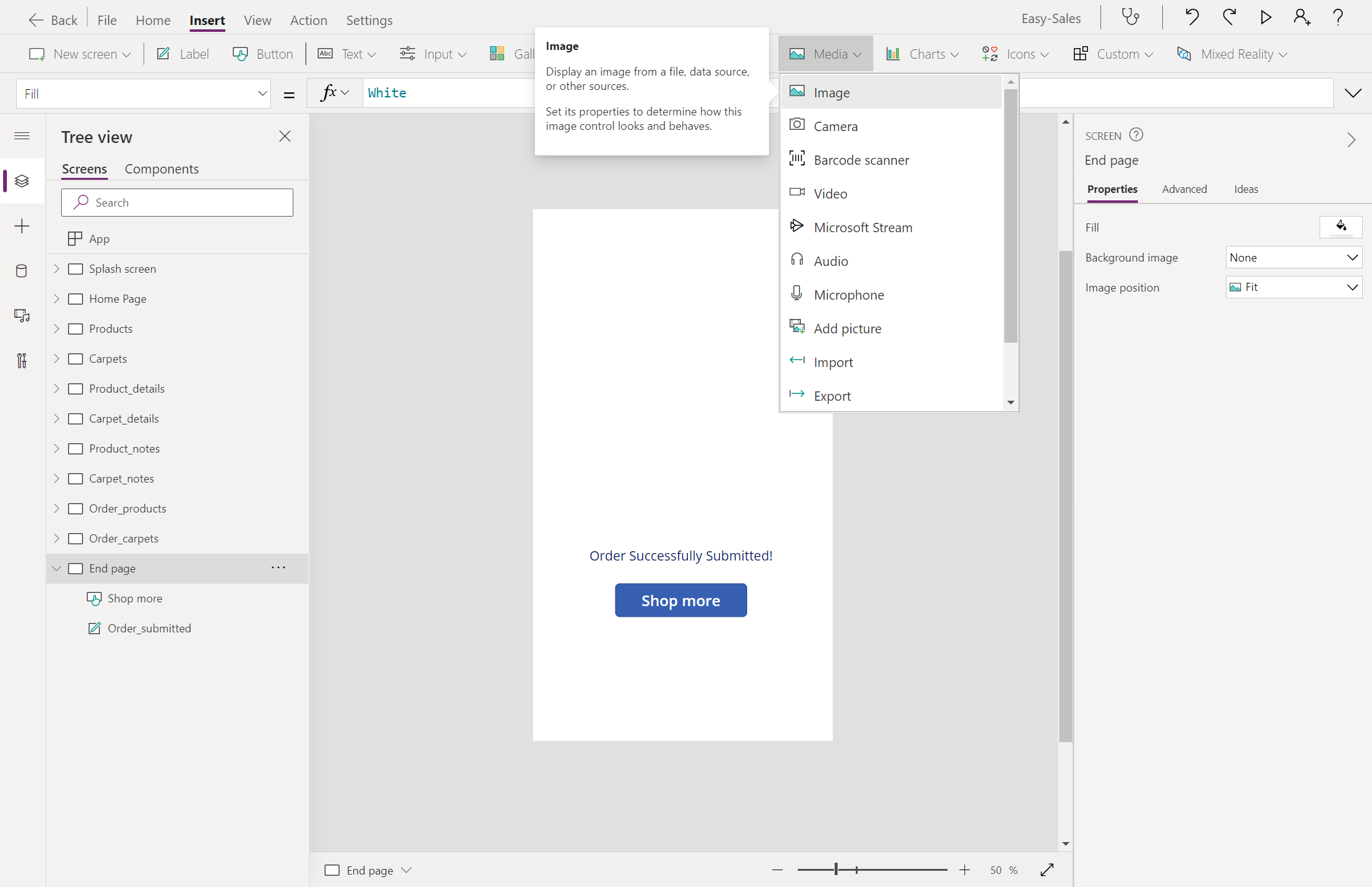 Navigate('Home Page',ScreenTransition.Cover)הרחב את הרשימה הנפתחת מדיה ובחר תמונה כדי להוסיף רכיב תמונה לדף הסיום.