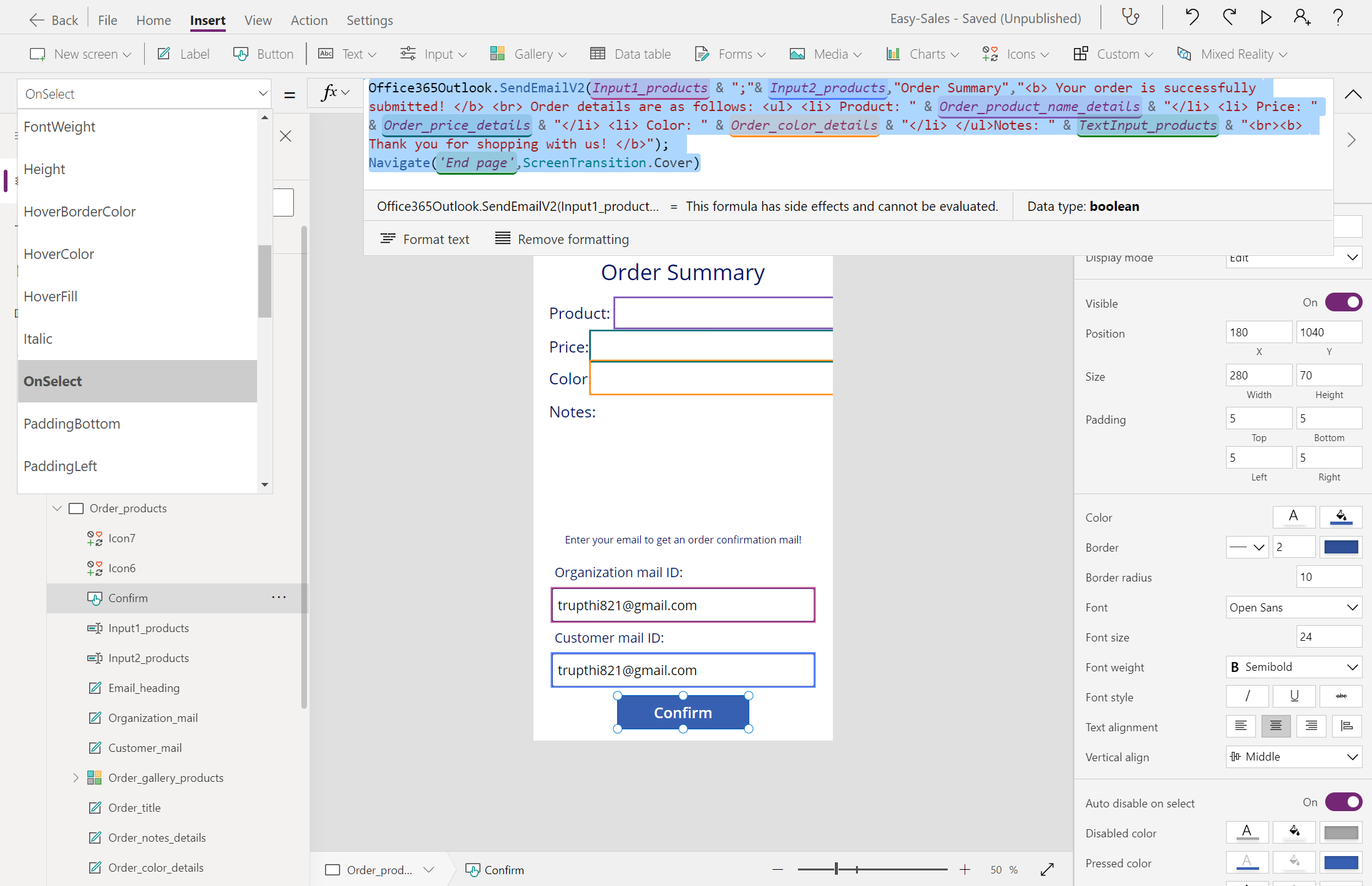Office365Outlook.SendEmailV2(Input1_products & ";"& Input2_products,"Order Summary","<b> Your order is successfully submitted! </b> <br> Order details are as follows: <ul> <li> Product: " & Order_product_name_details & "</li> <li> Price: " & Order_price_details & "</li> <li> Color: " & Order_color_details & "</li> </ul>Notes: " & TextInput_products & "<br><b> Thank you for shopping with us! </b>"); Navigate('End page',ScreenTransition.Cover)הערה
