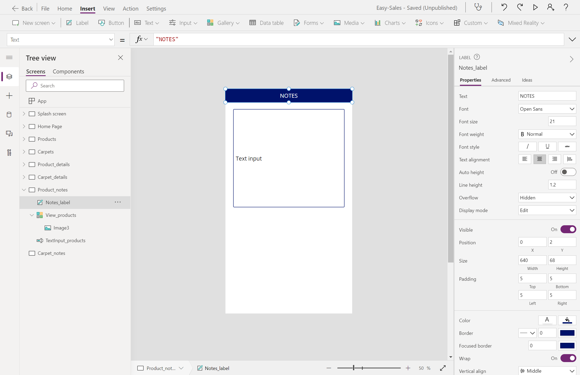 בוא נוסיף תווית בחלק העליון של המסך. בחר באפשרות תווית ולאחר מכן יישר אותה למרכז . התאם אישית את המיקום, הצבע ותצוגת הטקסט בהתאם לצרכים שלך. שנה את שמו Notes_label.