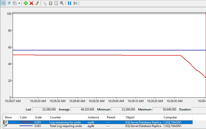 Monitor reverting state progress using the performance counters SQL Server:Database Replica:Total Log Requiring Undo and SQL Server:Database Replica:Log Remaining for Undo and choose the availability group database for the Instance. In the example in the following screenshot, Total Log Requiring Undo is reported as 56.3 mb, and Log Remaining for Undo is slowly dropping to 0 that is reporting reverting progress.