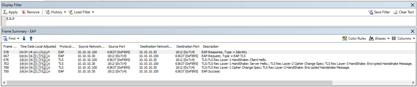 If you collect a network packet capture on both the client and the server (NPS) side, you can see a flow like the one below. Type EAPOL in the Display Filter for a client-side capture, and EAP for an NPS-side capture. See the following examples: