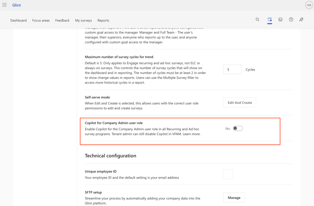 Starting July 2025, Viva Glint introduces a new feature toggle that allows Service Admins to enable Copilot for themselves at the client level—without modifying the default permissions of the Service Admin role in individual survey programs.