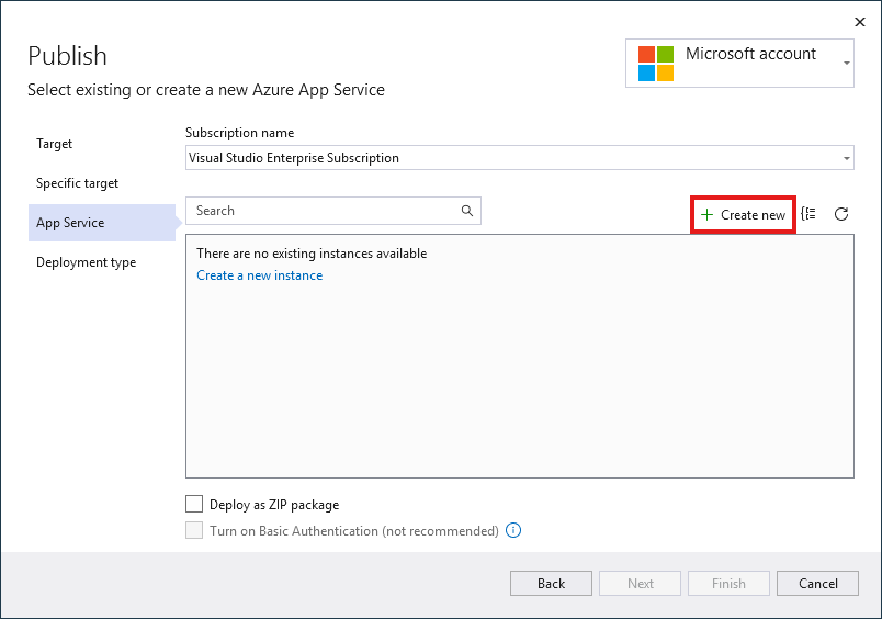 In the Publish dialog, ensure your new App Service app is selected, then select Finish, then select Close. Visual Studio creates a publish profile for you for the selected App Service app.