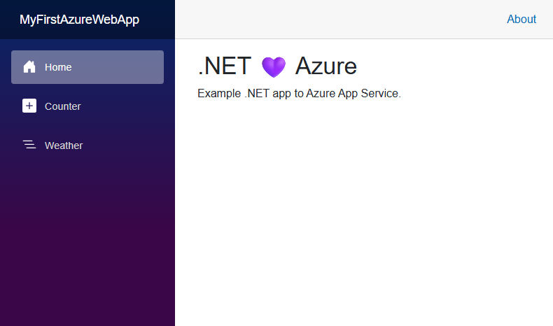 @page "/" <PageTitle>Home</PageTitle> <h1>.NET 💜 Azure</h1> Example .NET app to Azure App Service.From the application root folder, prepare your local MyFirstAzureWebApp application for deployment using the dotnet publish command: