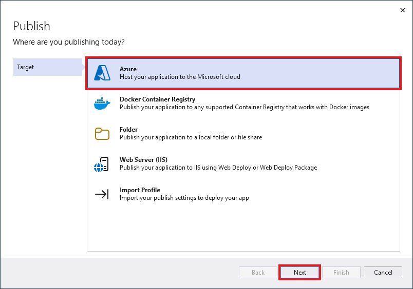 In Publish, select Azure and then Next.