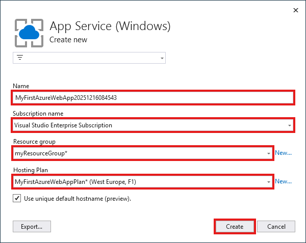 a-z,A-Z,0-9, and-. You can accept the automatically generated unique name.Select Create to create the Azure resources.
