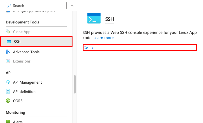https://<app-name>.scm.azurewebsites.net/webssh/hostand sign in with your Azure account. Replace<app-name>with the name of your web app.When you sign in, you're redirected to an informational page for the web app. Select SSH at the top of the page to open the shell and use commands.