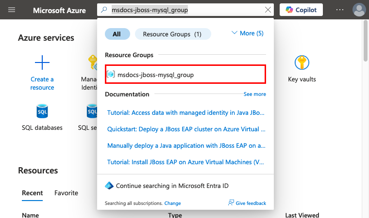 - In the top search bar, type msdocs-jboss-mysql-server.