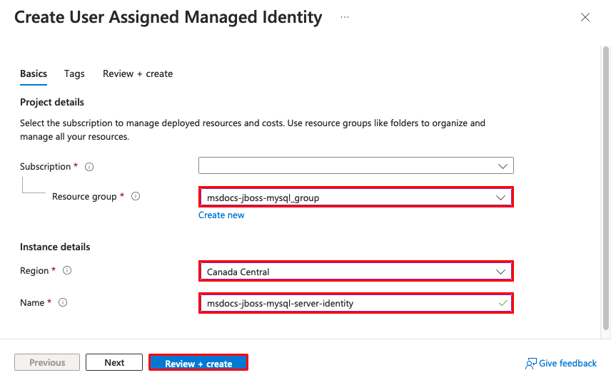 - In Name, type msdocs-jboss-mysql-server-identity.