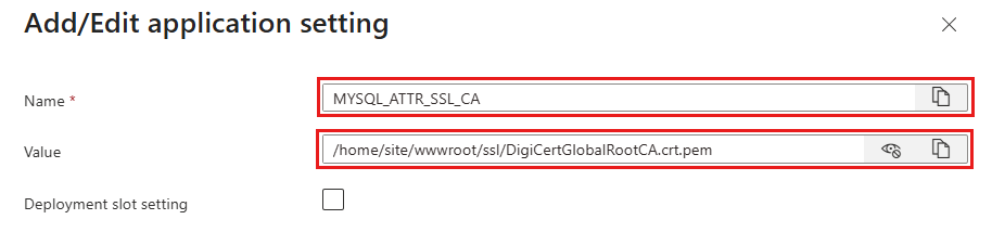 - In Add/Edit application setting, in the Value field, copy the username and password for use later. The connection string lets you connect to the MySQL database secured behind private endpoints. The secrets are saved directly in the App Service app, which isn't the best. You'll change this configuration.