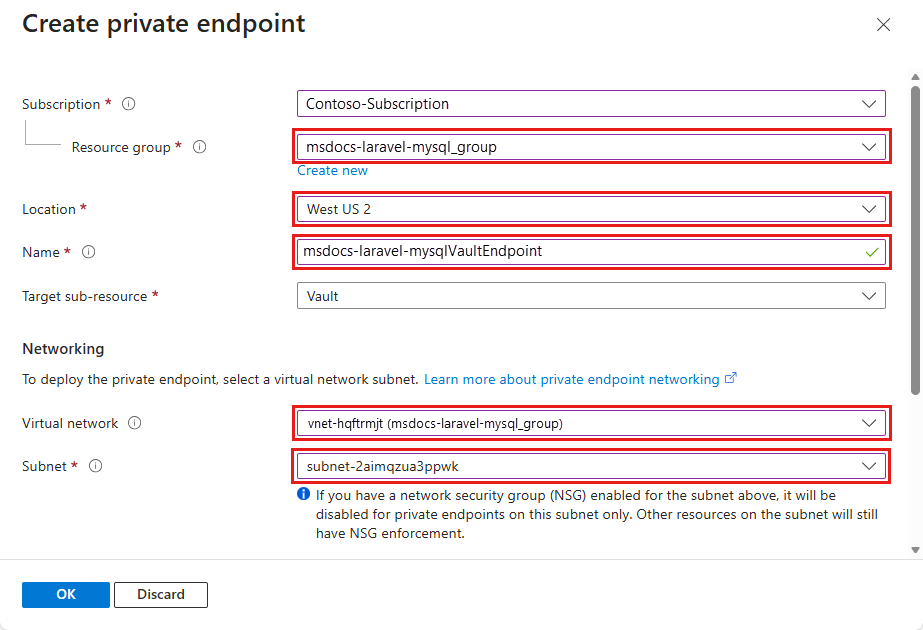 - In Name, enter msdocs-laravel-mysqlVaultEndpoint.
