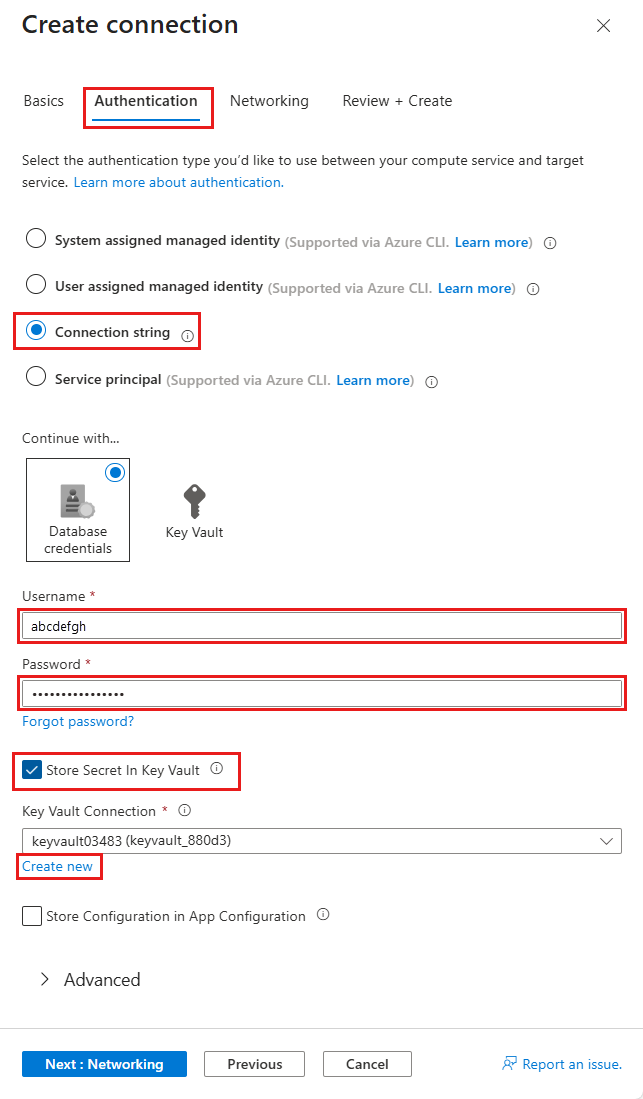 Deployment generated the connectivity variables for you already as app settings. The security best practice is to keep secrets out of App Service completely. Move your secrets to a key vault and change your app setting to Key Vault references with the help of Service Connectors.