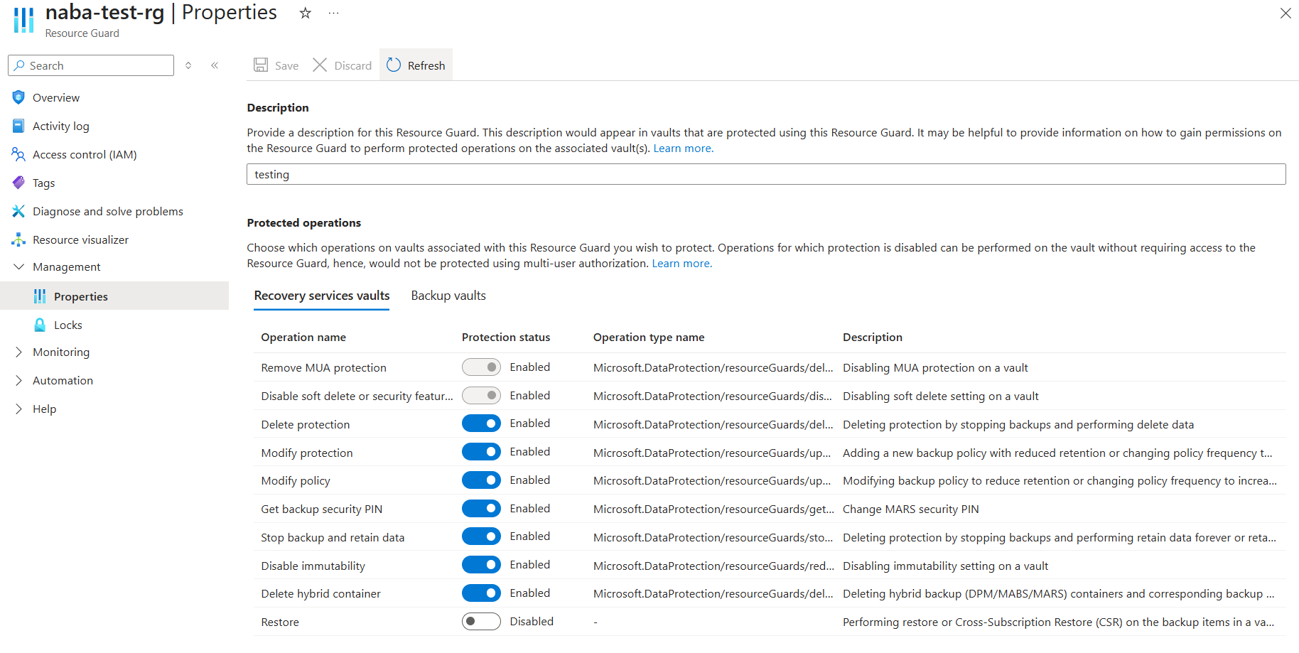 Optionally, in the Backup vaults tab, update the description for the Resource Guard.