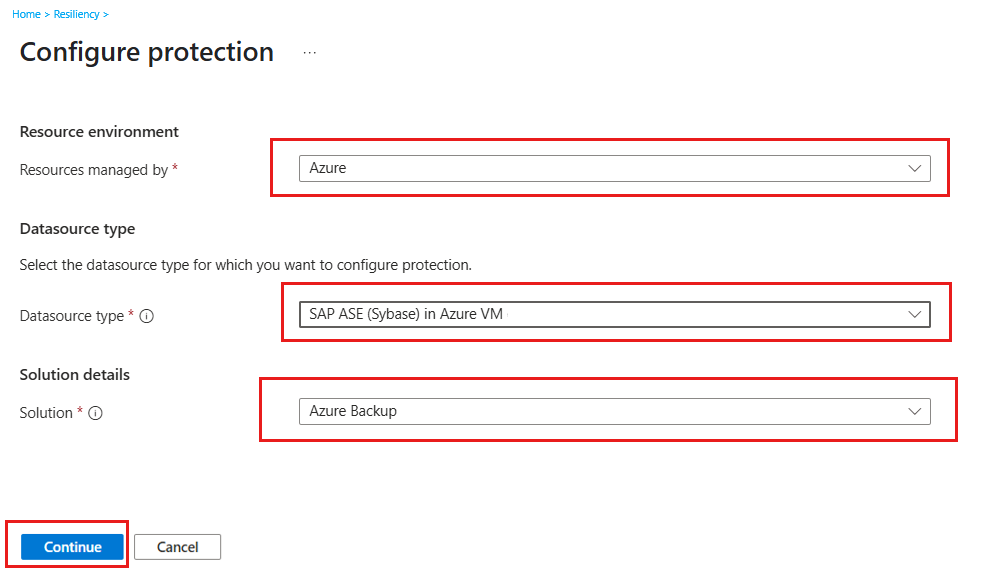 On the Configure protection pane, select Resource managed by as Azure, Datasource type as SAP ASE (Sybase) in Azure VM, and Solution as Azure Backup.