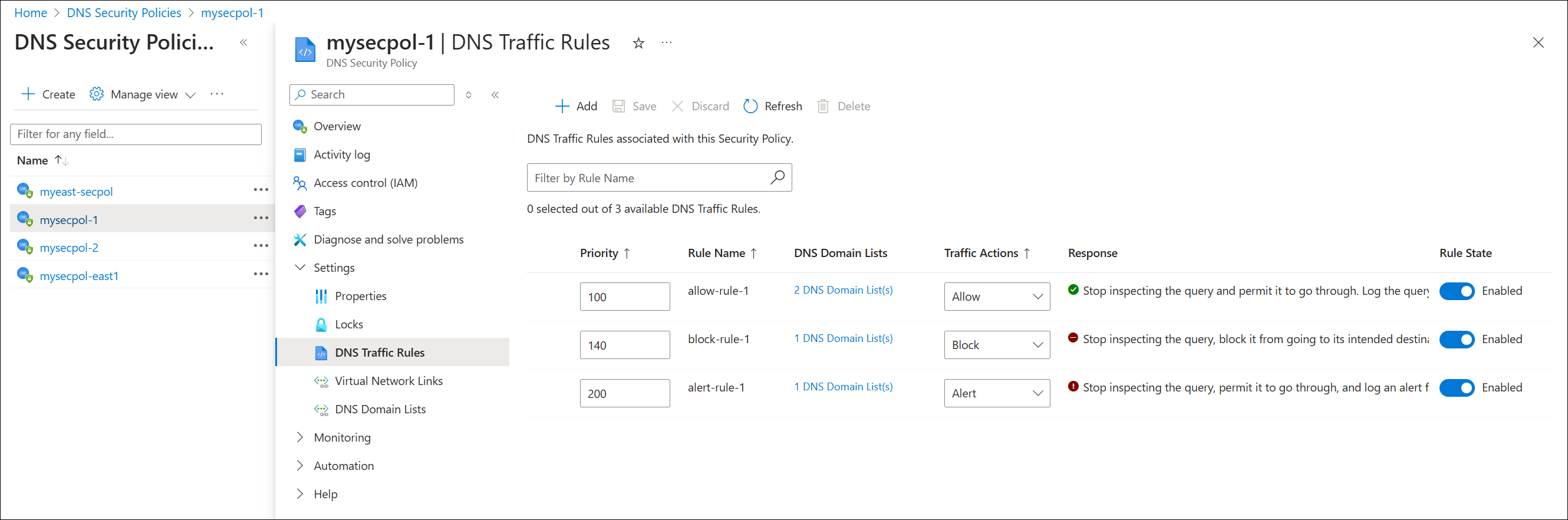 To display DNS traffic rules in the Azure portal, select a DNS security policy and then under Settings, select DNS Traffic Rules. See the following example: