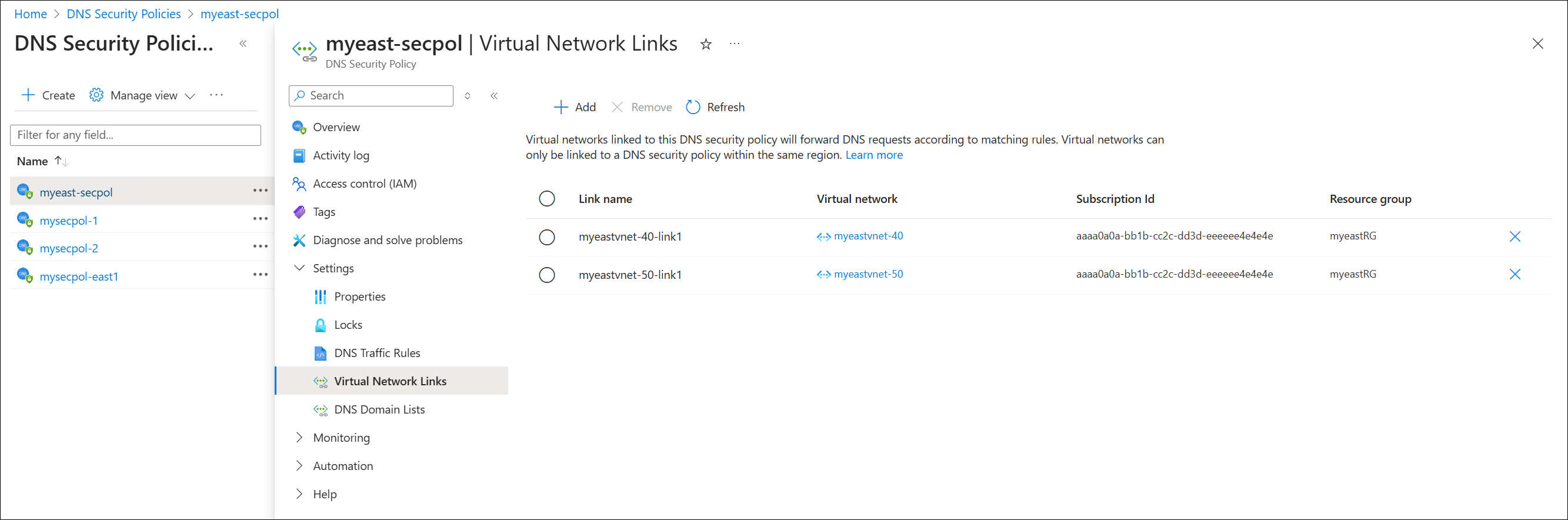 The following example shows a DNS security policy linked to two VNets (myeastvnet-40, myeastvnet-50):