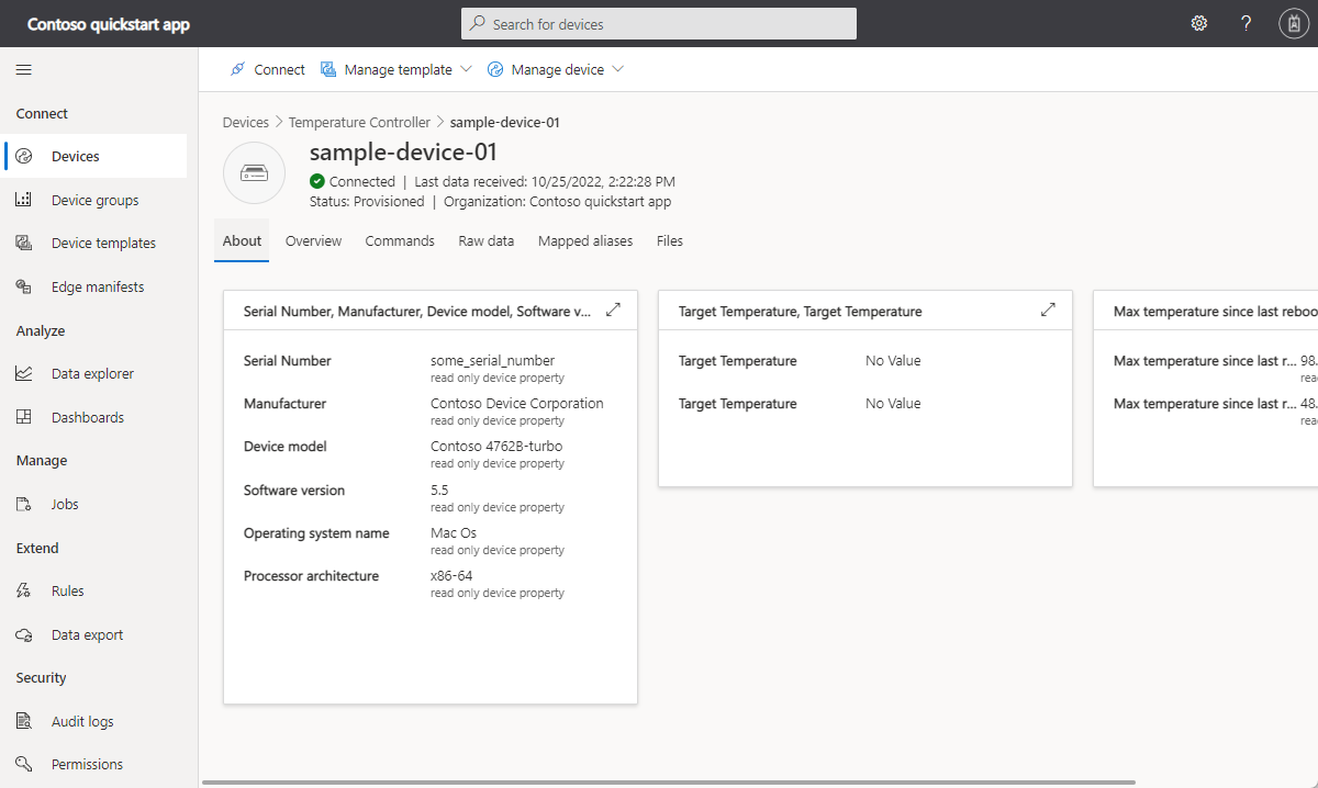 This tutorial shows you how to connect a client application to your Azure IoT Central application. The application simulates the behavior of a temperature controller device. When the application connects to IoT Central, it sends the model ID of the temperature controller device model. IoT Central uses the model ID to retrieve the device model and create a device template for you. You add views to the device template to enable an operator to interact with a device.