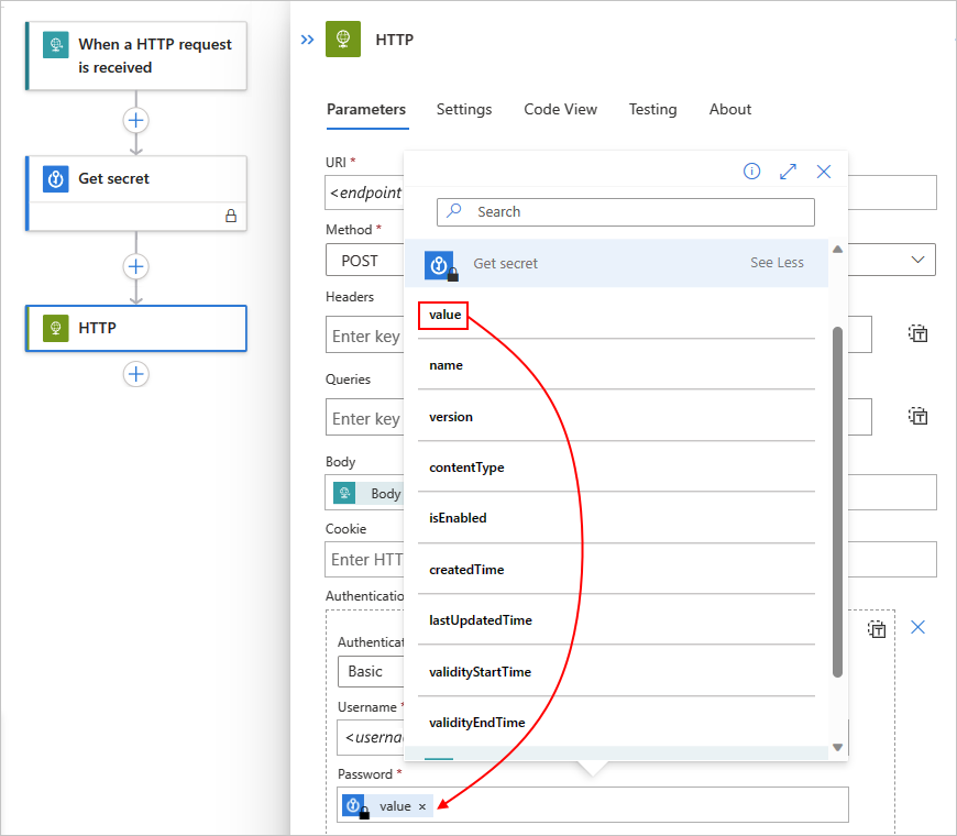 "secret": "@parameters('secretParam')"