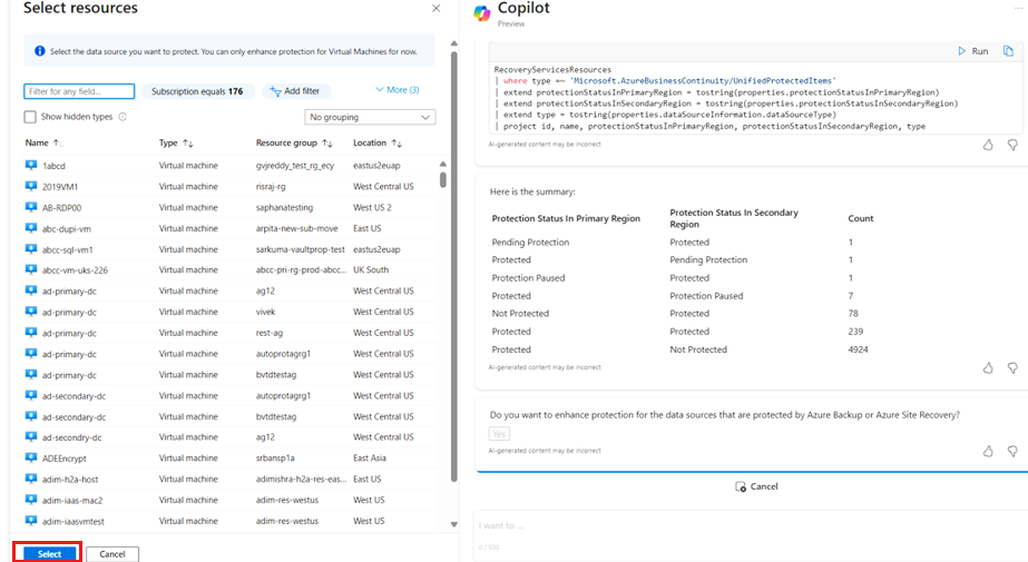 With Resiliency Copilot, you can check for the protection status of your Azure resources in the Azure portal using natural language directly. The Copilot retrieves information about your resources and their protection status and guides you through the relevant processes.
