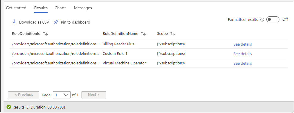 authorizationresources | where type =~ "microsoft.authorization/roledefinitions" | where tolower(properties.type) == "customrole" | extend rdId = tolower(id) | extend Scope = tolower(properties.assignableScopes) | join kind = leftouter ( authorizationresources | where type =~ "microsoft.authorization/roleassignments" | extend RoleId = tolower(tostring(properties.roleDefinitionId)) | summarize RoleAssignmentCount = count() by RoleId ) on $left.rdId == $right.RoleId | where isempty(RoleAssignmentCount) | project RoleDefinitionId = rdId, RoleDefinitionName = tostring(properties.roleName), ScopeThe following shows an example of the results: