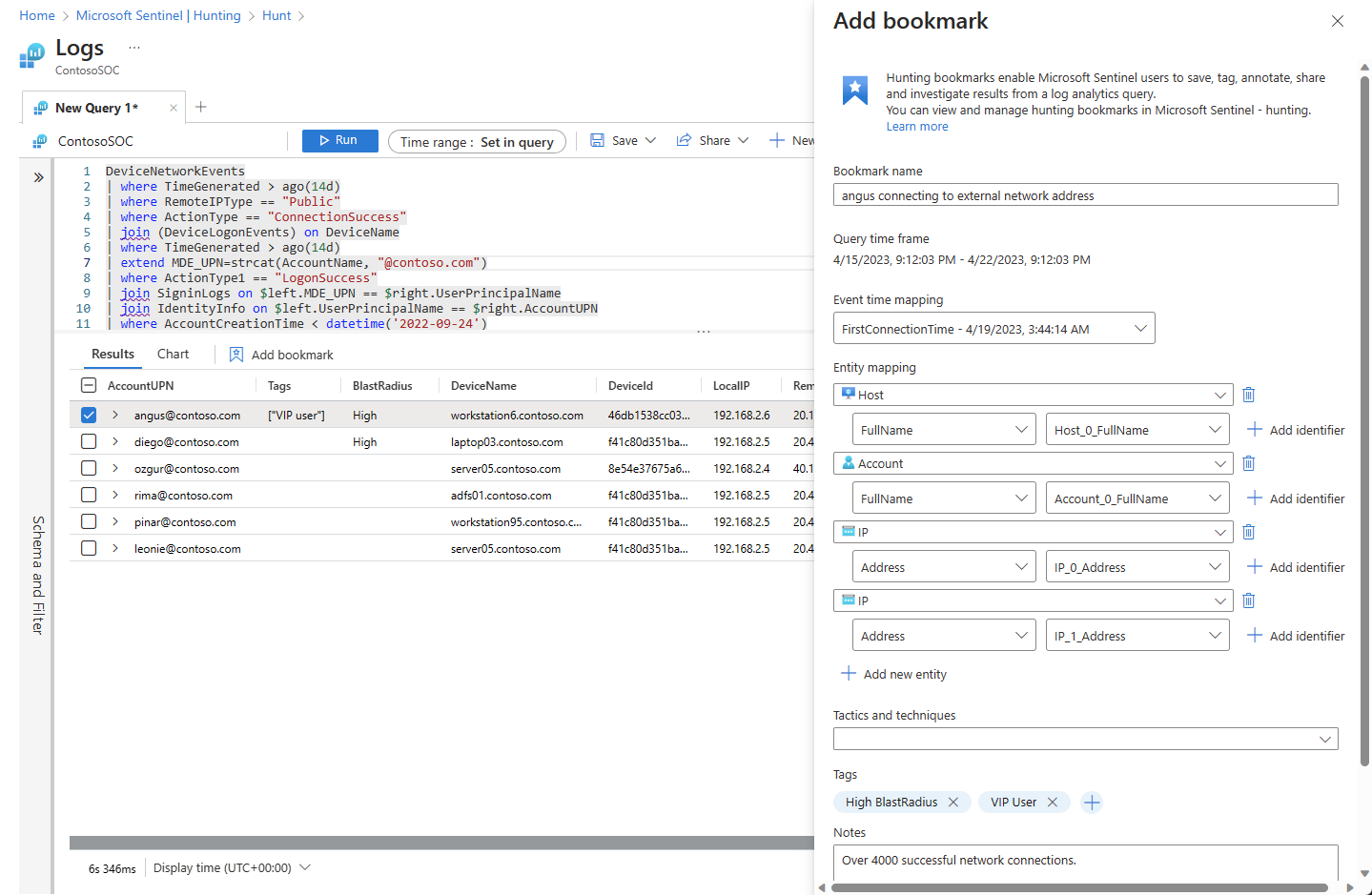 When you find interesting results or important rows of data, add those results to the hunt by creating a bookmark. For more information, see Use hunting bookmarks for data investigations.