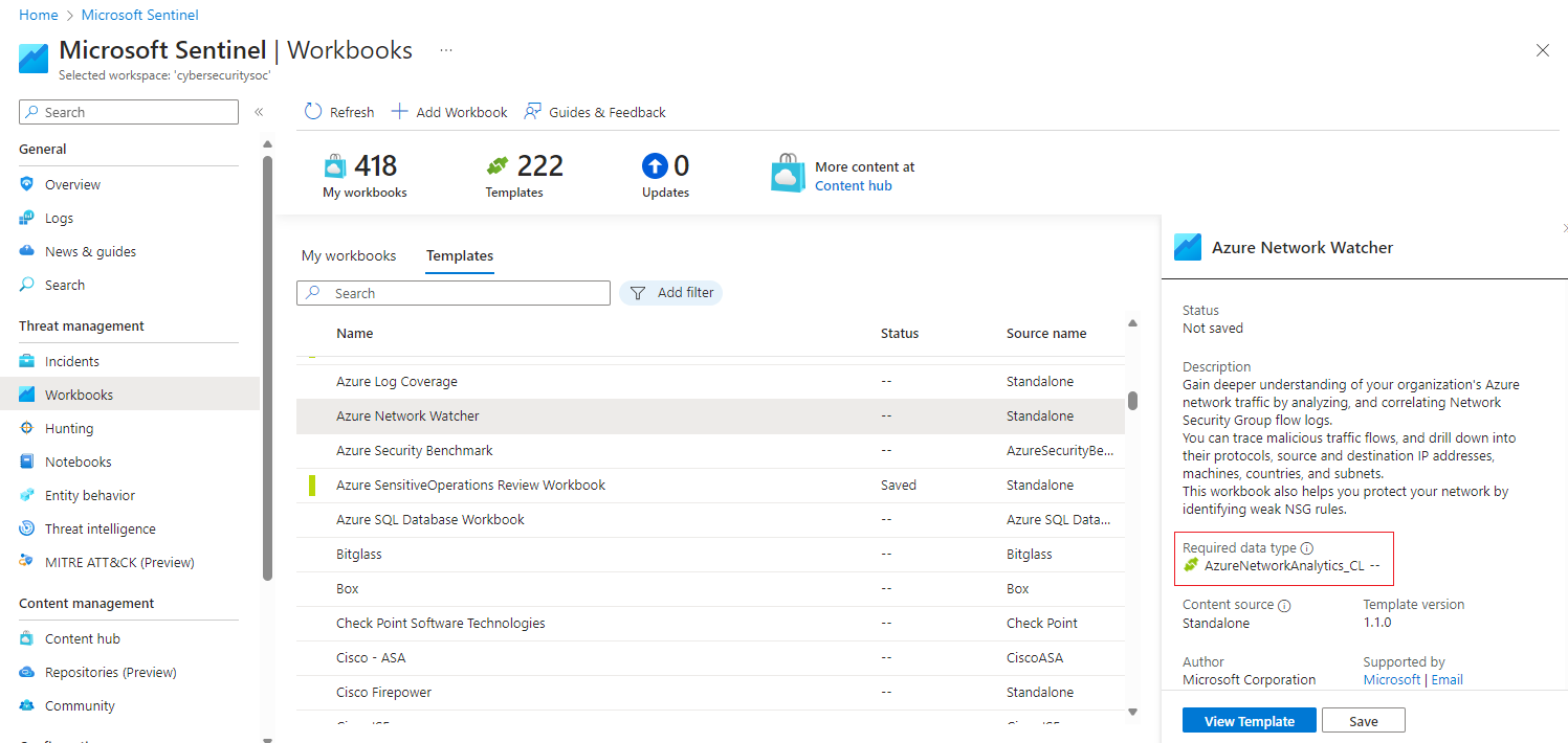 On the Workbooks page, select the Templates tab to see the list of workbook templates installed. Select a template to view its details.
