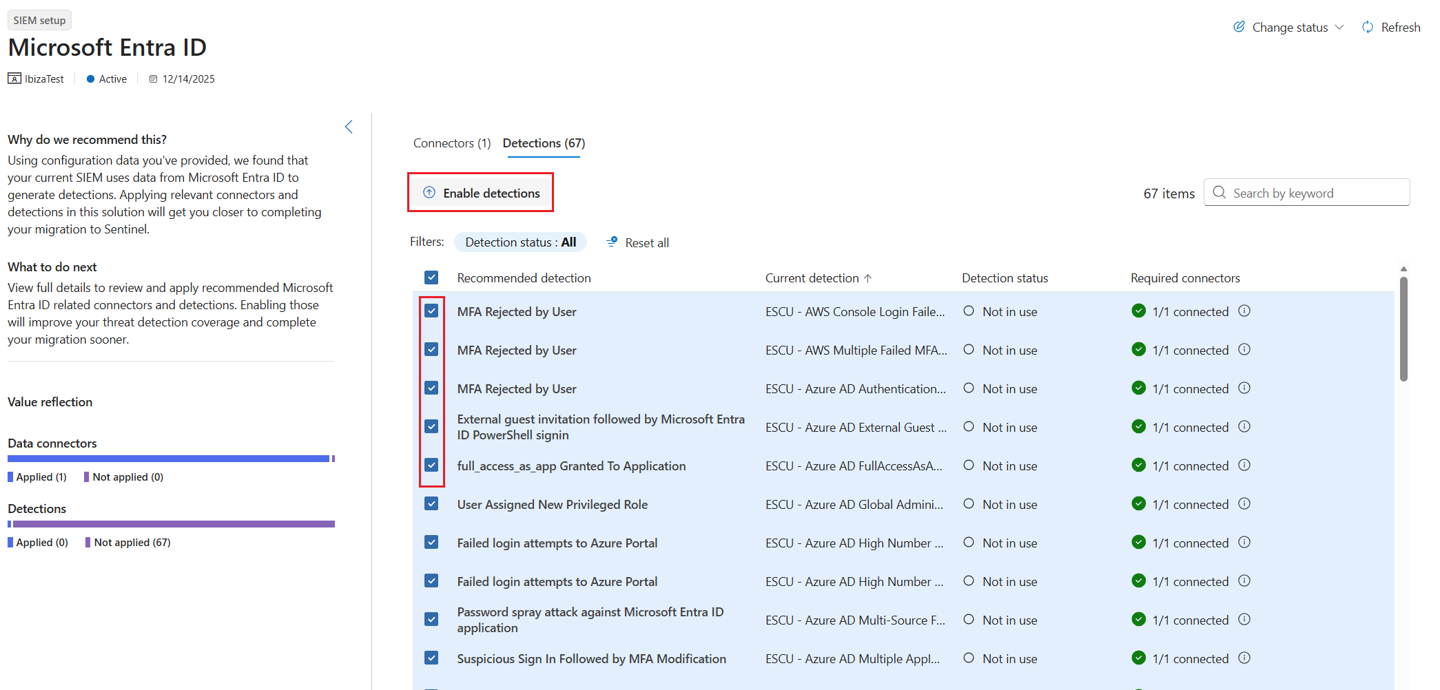 If the data connector isn't installed and configured to stream logs, Enable detection is disabled.
