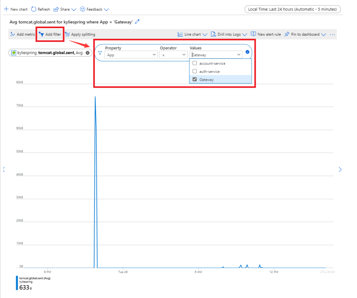 The default view includes all of an Azure Spring Apps service's application's metrics together. Metrics of one app or instance can be filtered in the display. Select Add filter, set the property to App, and select the target application you want to monitor in the Values text box.