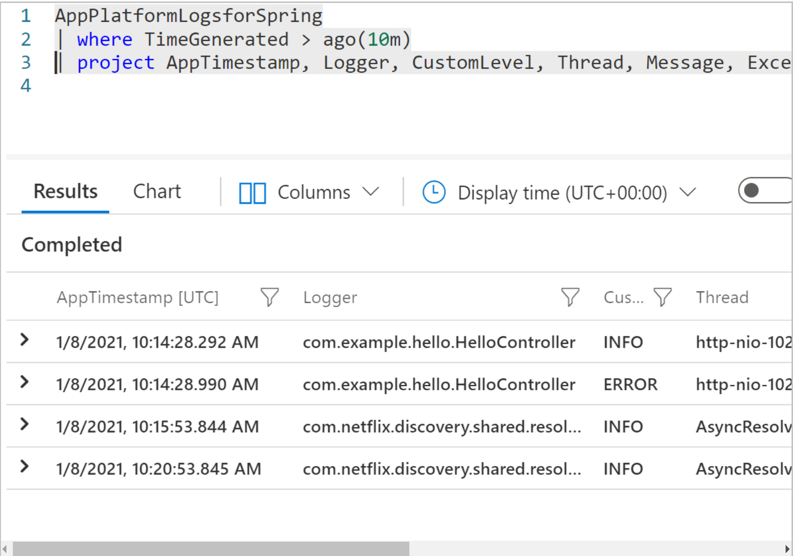 AppPlatformLogsforSpring | where TimeGenerated > ago(1h) | project AppTimestamp, Logger, CustomLevel, Thread, Message, ExceptionClass, StackTrace, TraceId, SpanIdApplication logs return as shown in the following image: