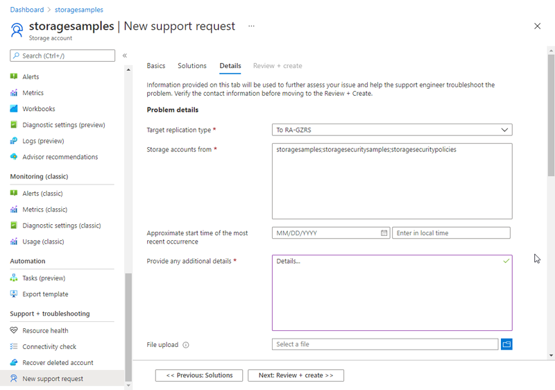 If you need to convert more than one storage account, create a single support ticket and specify the names of the accounts to convert on the Additional details tab.