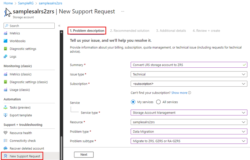 - Problem subtype: Choose Migrate to ZRS, GZRS, or RA-GZRS.