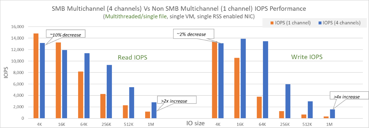 - For smaller I/O sizes, there was a slight impact of approximately 10% on performance with SMB Multichannel enabled. This could be mitigated by spreading the load over multiple files, or disabling the feature.