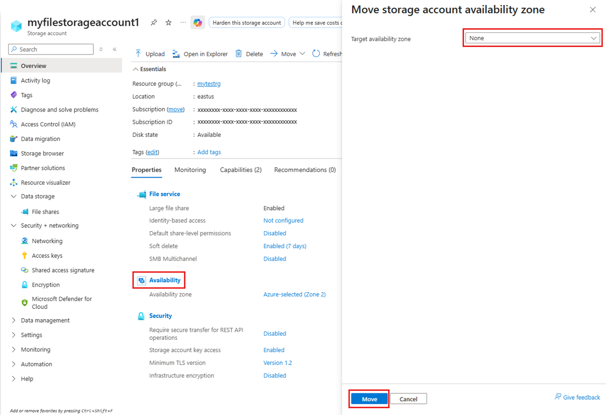 The storage account will now be pinned to the selected zone, as reflected in the Availability section on the Overview tab.