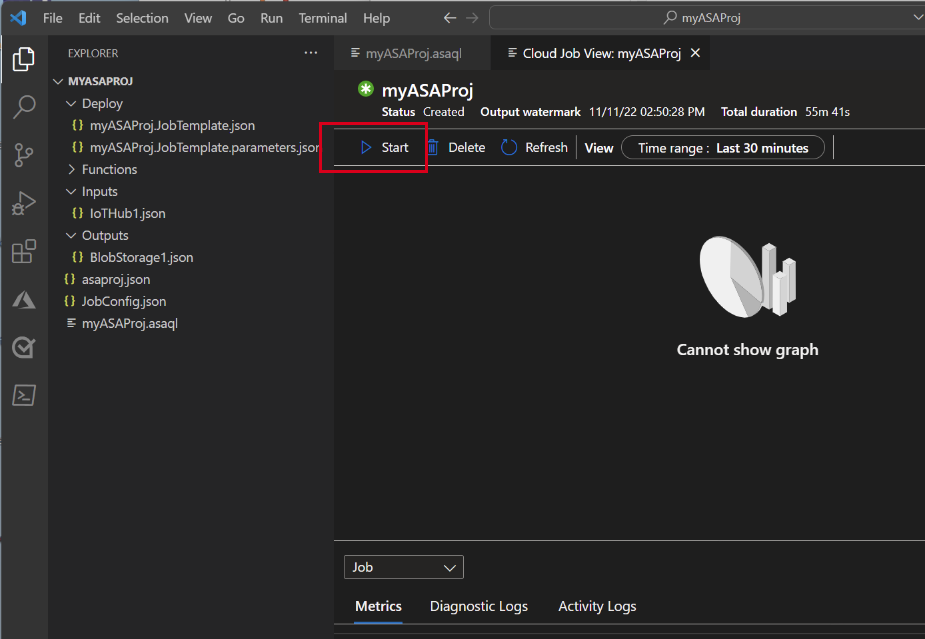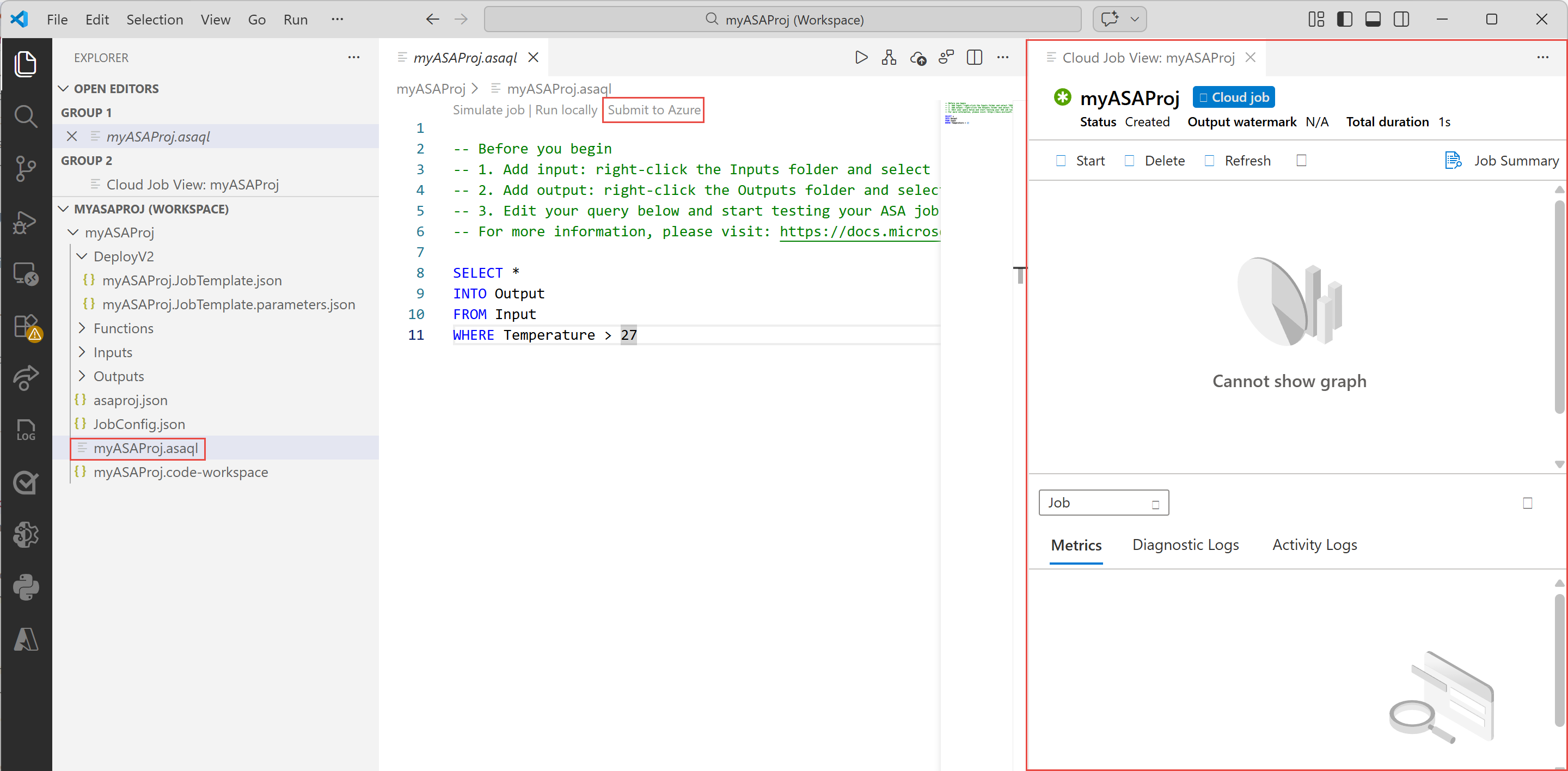 Visual Studio Code adds an ASA project to your workspace. It consists of three folders: Inputs, Outputs, and Functions. It also has the query script (*.asaql), a JobConfig.json file, and an asaproj.json configuration file.