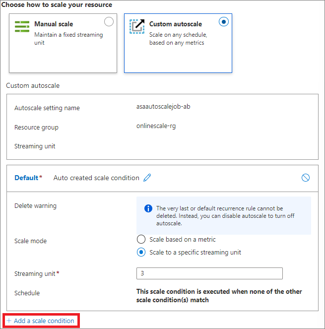 You can configure automatic scaling of streaming units by using conditions. The Default scale condition is executed when none of the other scale conditions match. As such, you must select a Default condition for your job. You may choose a name for your Default condition or leave it as Auto created scale condition, which is pre-populated.