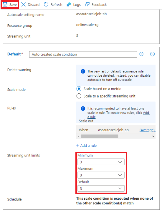 Follow these steps to configure the rule to scale the job to use specific number of streaming units. Again, the default condition is applied when none of the other scale conditions match.