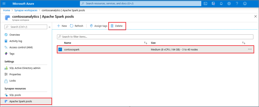 - Select the Apache Spark pool to be deleted (in this case, contosospark).