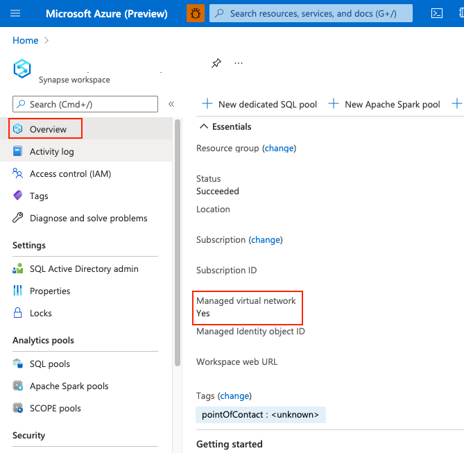 After the workspace is created, you can check whether your Azure Synapse workspace is associated to a Managed workspace Virtual Network by selecting Overview from Azure portal.