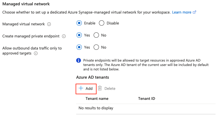 You can also control the targets to which Managed private endpoints are created from your Azure Synapse workspace. By default, Managed private endpoints to resources in the same Microsoft Entra ID tenant that your subscription belongs to are allowed. If you want to create a Managed private endpoint to a resource in a Microsoft Entra ID tenant that is different from the one that your subscription belongs to, then you can add that Microsoft Entra ID tenant by selecting + Add. You can either select the Microsoft Entra ID tenant from the dropdown or manually enter the Microsoft Entra ID tenant ID.