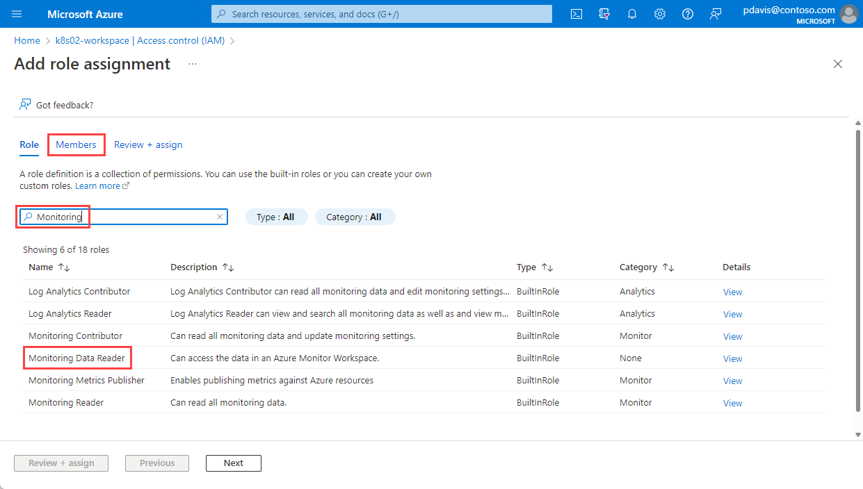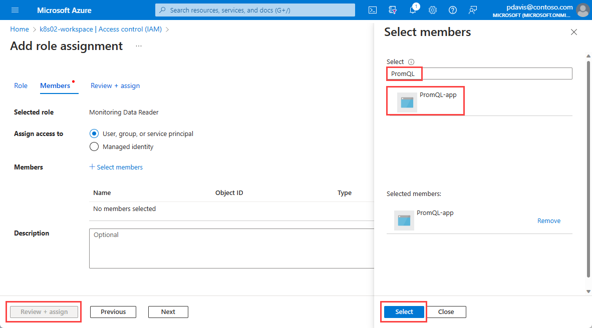 Assign the Monitoring Data Reader role to your app so that it can query data from your Azure Monitor workspace.
