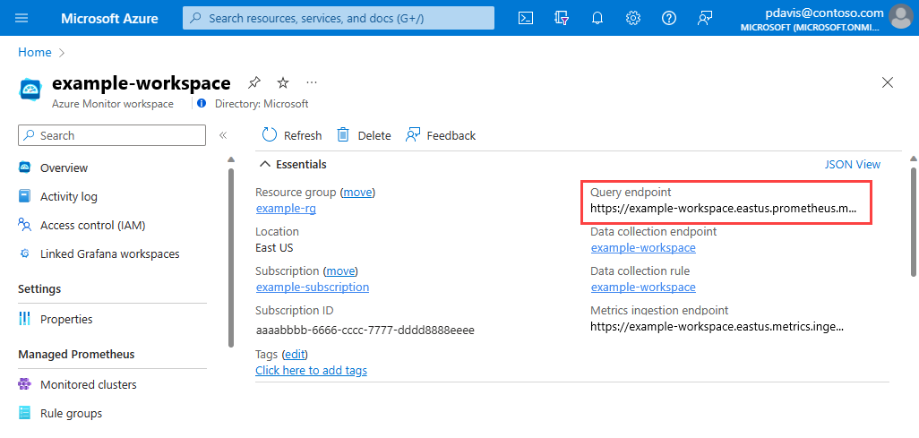 Find your Azure Monitor workspace's query endpoint on the Azure Monitor workspace Overview page.